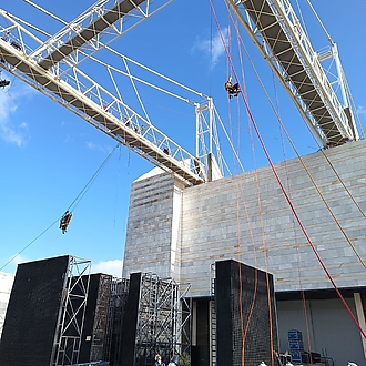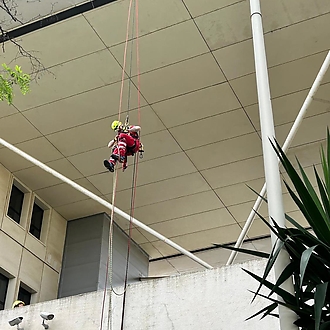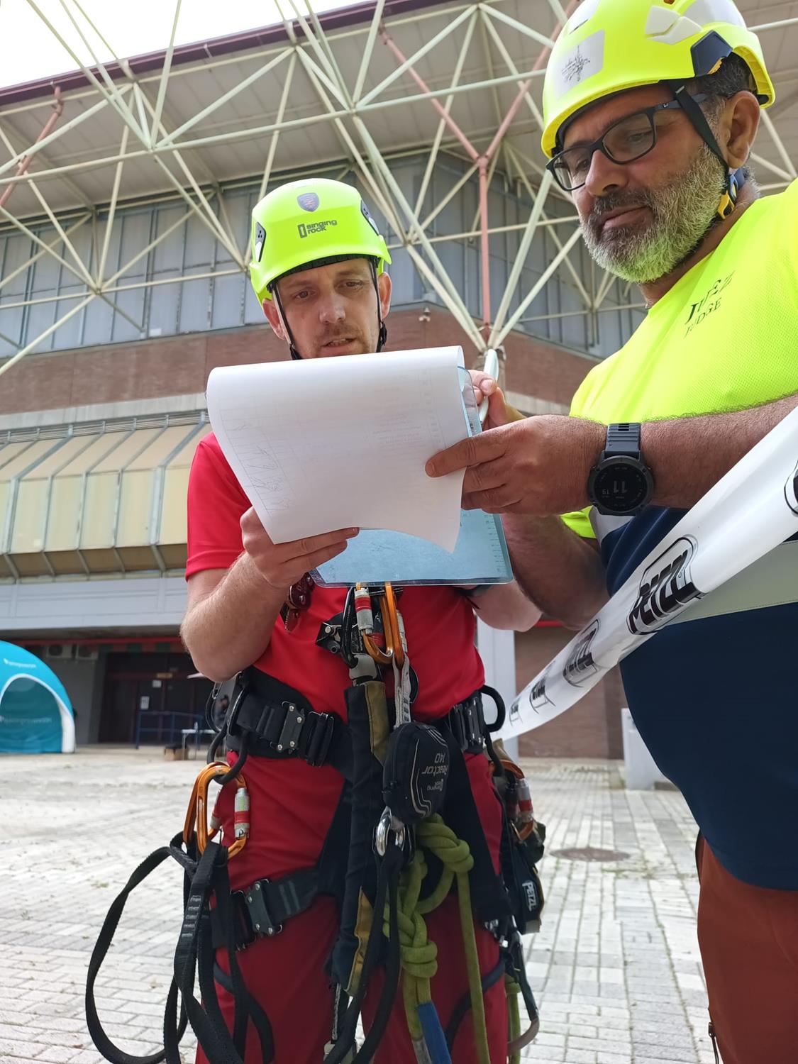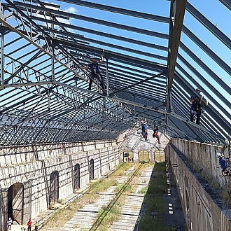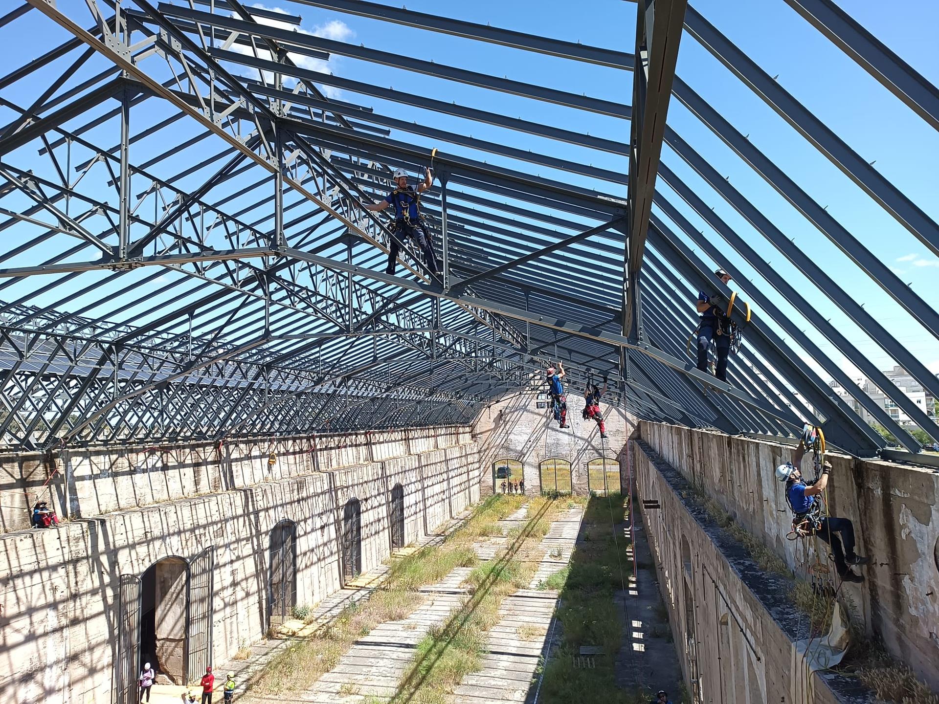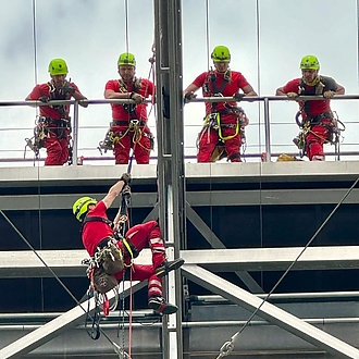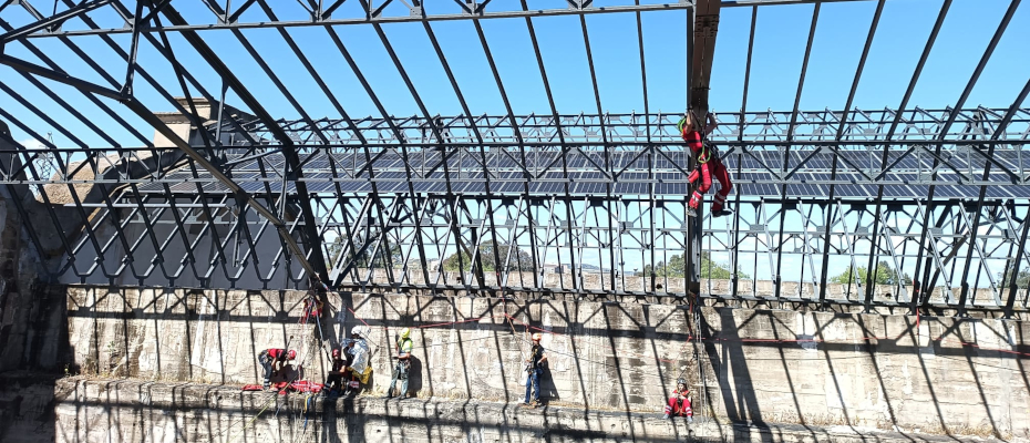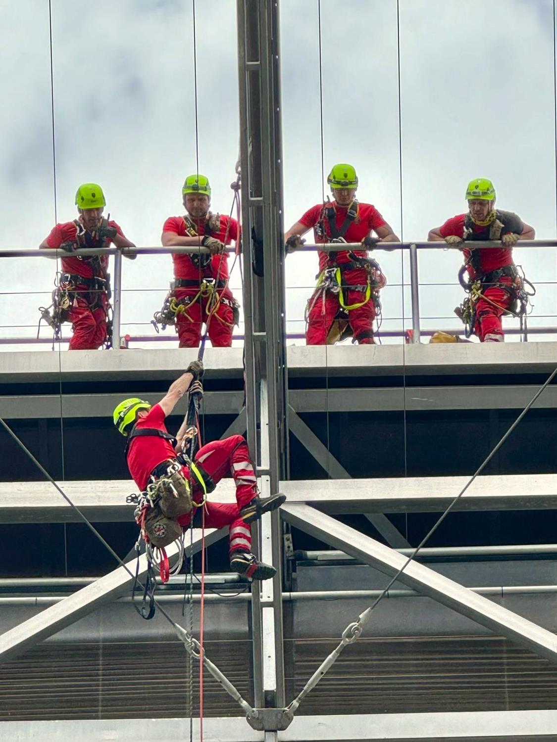 The second task of the day was to install ropes into the roof truss structure and then move through the roof of the production hall to the opposite wall of the building, where we extricated an injured person using a stretcher and two lowering systems to a predetermined location near the starting point.