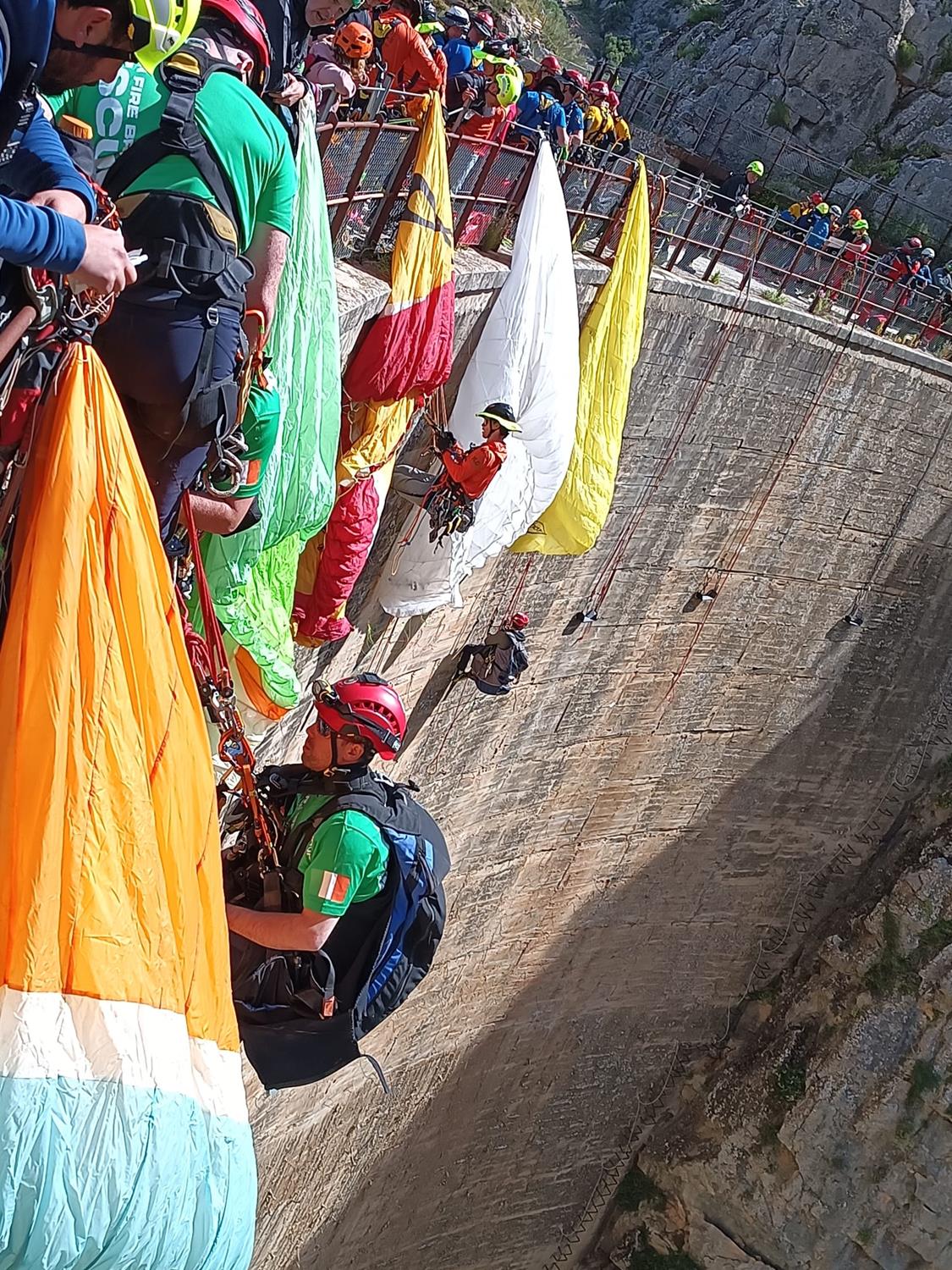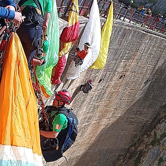For the second task, a paraglider suspended from the crown of the dam was waiting for us. The goal was to haul him and his seat up to a safe place.