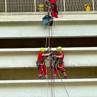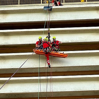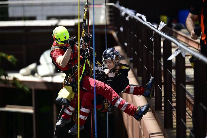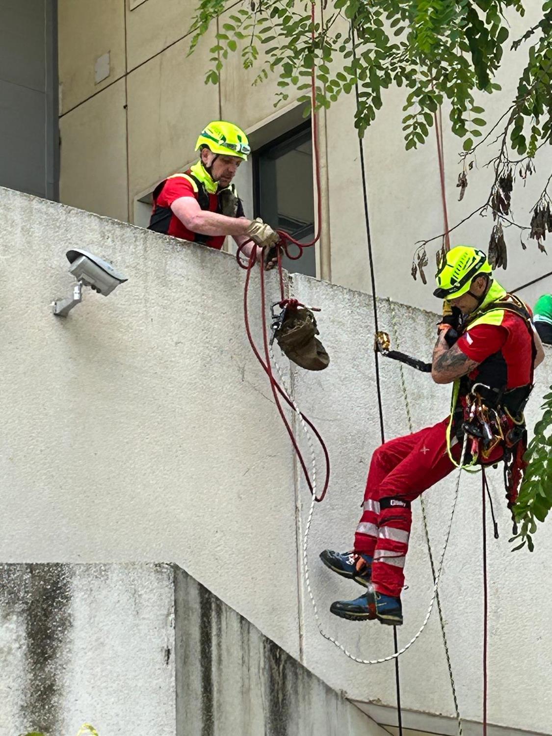The next task followed with the injured woman on the middle terrace of the building. One team member lowered ropes from the roof to the ground so that the others could climb up to the injured person and get her on a stretcher to the ground.