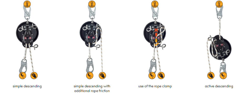 The range of the rescue lifting function of EvaQ HUB according to EN 1496:2007 is not legally limited. However, during the lifting, the rope is again enormously strained and frequent use may lead to slip. Normally, this is not dangerous and you can descend safely to the ground. The maximum lifting distance should however not be more than 10 times the rope length. Make sure to check rope abrasion accordingly.