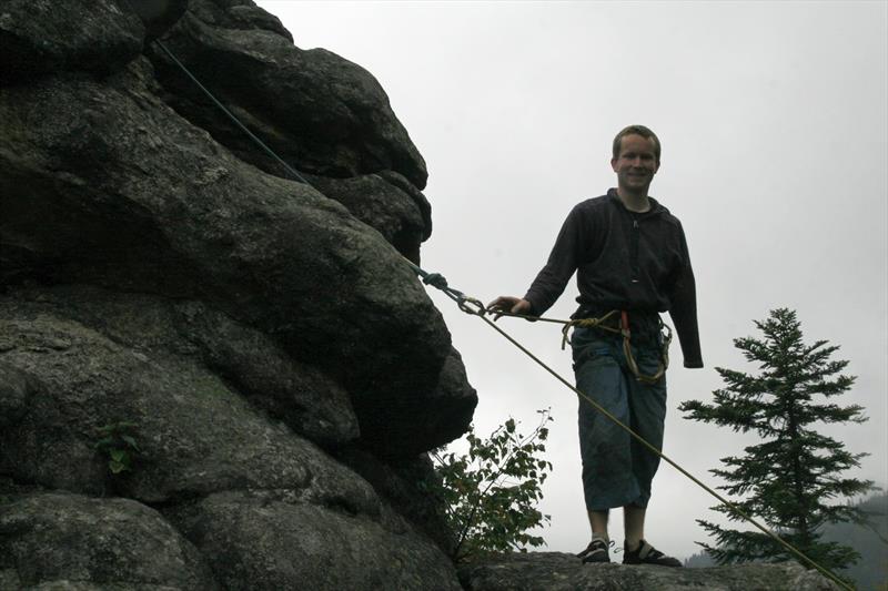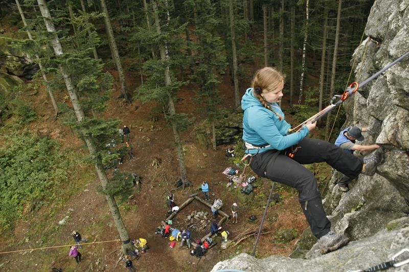 To the surprise of us more experienced who know the situation, sometimes we were there all alone, which is incredible. Everything runs smoothly at Dratnik on Saturday, we prepare the routes, make a ropeway between Sokol and Orel... and, most importantly, enjoy it all day long. The ropes are available also to other climbers, and are used by many of them. Who is lucky enough to immediately start climbing and also save their own rope... erm, I wanted to say try new Singing Rock products? We conclude this great day with a get-together with projection of photos and stories from Kilimanjaro ascent, but some of us already start falling asleep. So let’s jump to our sleeping bags and sleep tight.It’s foggy in the morning but warmer, so even those with summer sleeping bags slept well and were not cold. We pack out stuff quickly a after breakfast we are off to Ctyri palice. There are more climbers but we don’t disturb each other and all can fit in. And again some “strangers” use the opportunity and “test our products”. Those who have had enough climbing discuss with mountain guide Tonda Volek about technical climbing and its classification, try to tie some knots, belaying, etc. Such as six-year-old deaf Tony with a belay on a loop around a stone happy how his adult aunt goes down the rock pretty fast when the rope is loose... :)