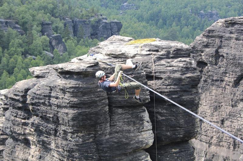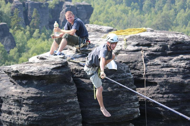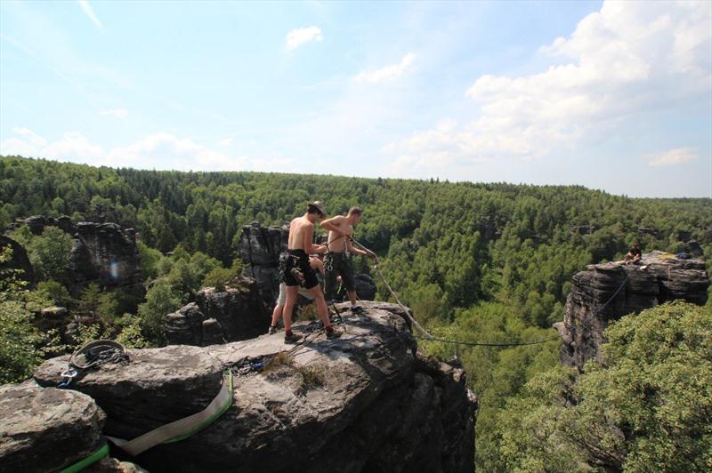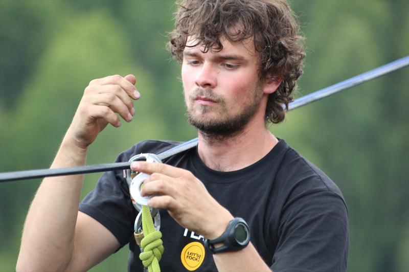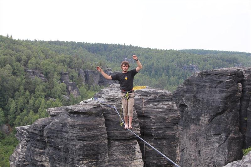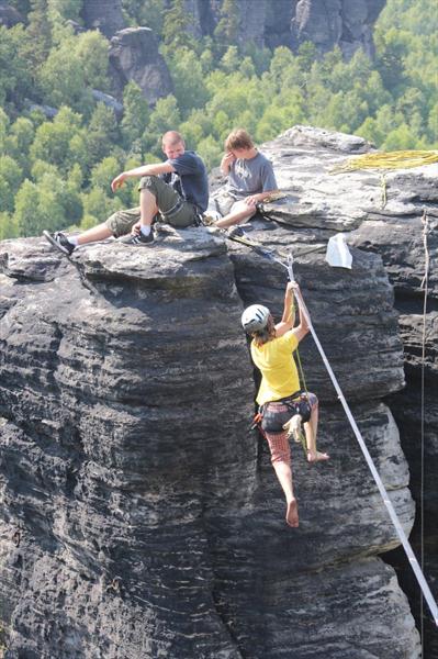 Morning – pulling out the training slacklines (max. height 3 m), training to get up the slackline using the highline daisy chain. Another training slackline (max. height 1m) – training to get up the slackline by push-up.