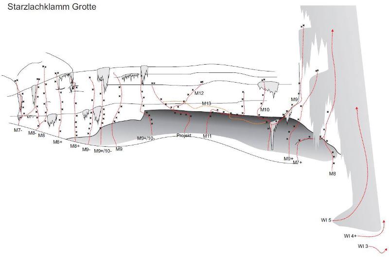 The time came. At the end of February 2014 Starzlachklamm gorge was visited by Lucie and Mirek. Lucie arranged the first repeat as well the first women's ascent. Mirek (after unsuccessful tries from last year) can notch up the second repeat. Both of them were panting and falling but at last they succeeded. Lucie said that it had been one of the most difficult lines so far. Perhaps the route could be marked as M14...