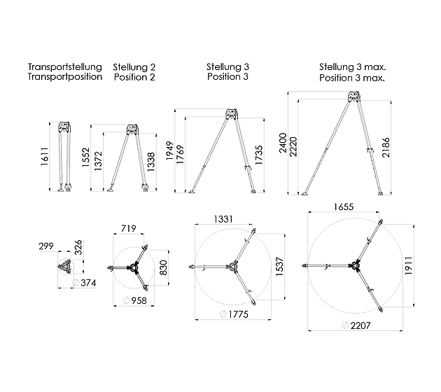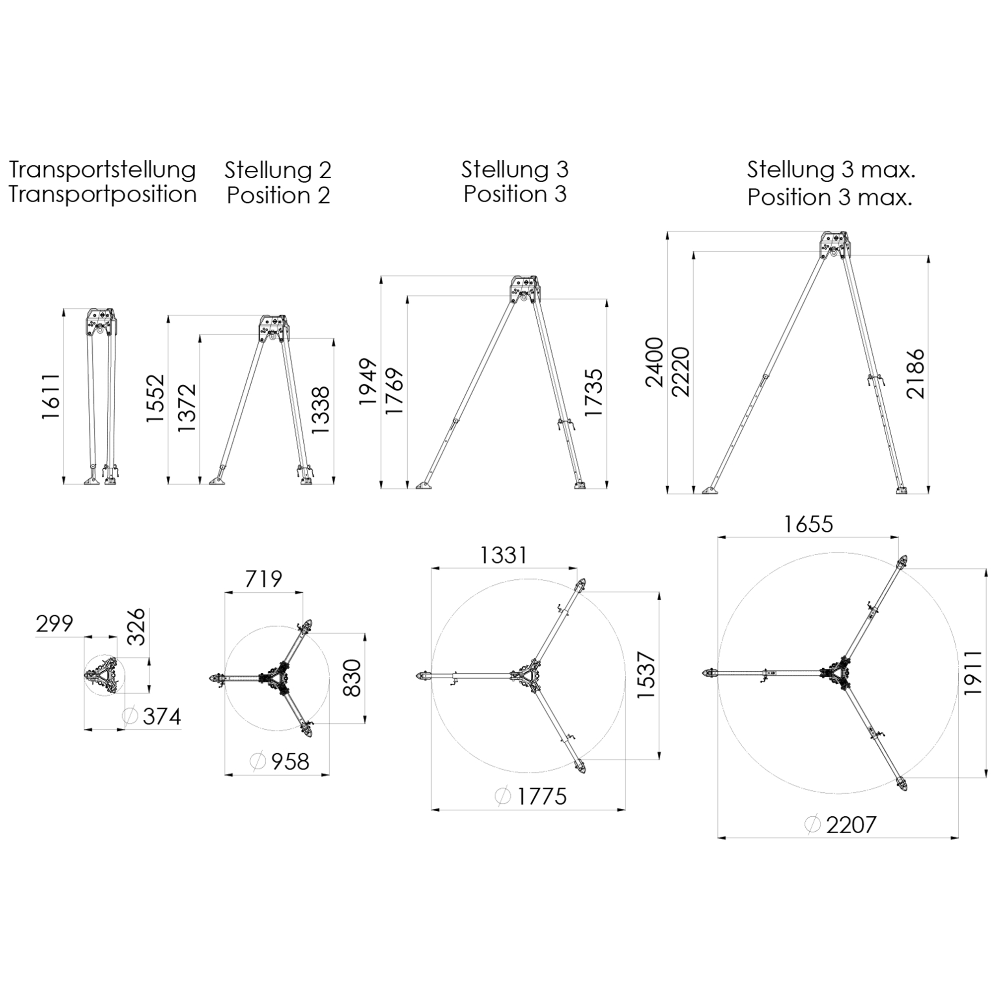 • up to 2.54 m high aluminium tripod with corrosion-resistant coating featuring 3 bolts-in anchor points