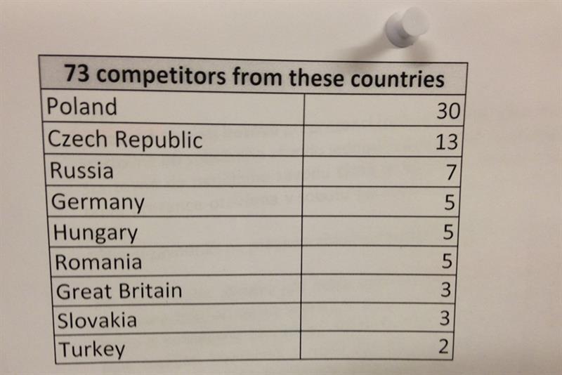 In the competition 73 contestants from 9 countries took part. Most people came from Poland (30), the Czech Republic was represented by 13 climbers, 7 competitors came from Russia, 5 from Germany, 5 from Hungary, 5 from Romania, 3 from the UK, 3 from Slovakia and also 2 from Turkey.