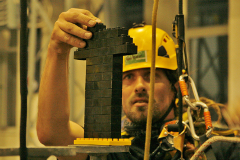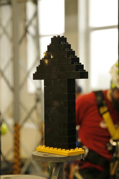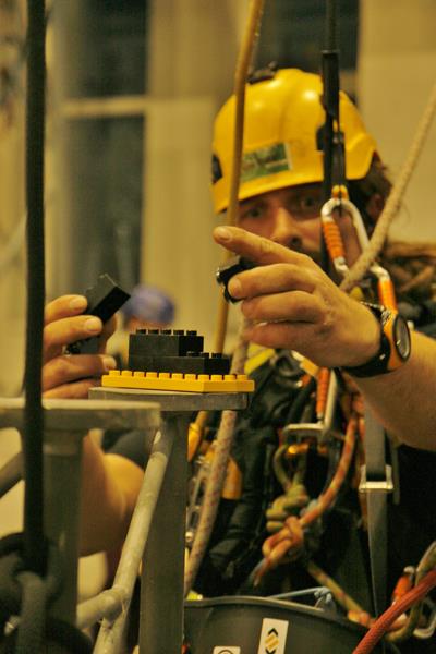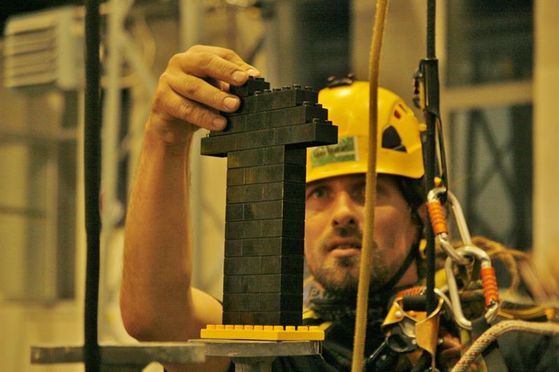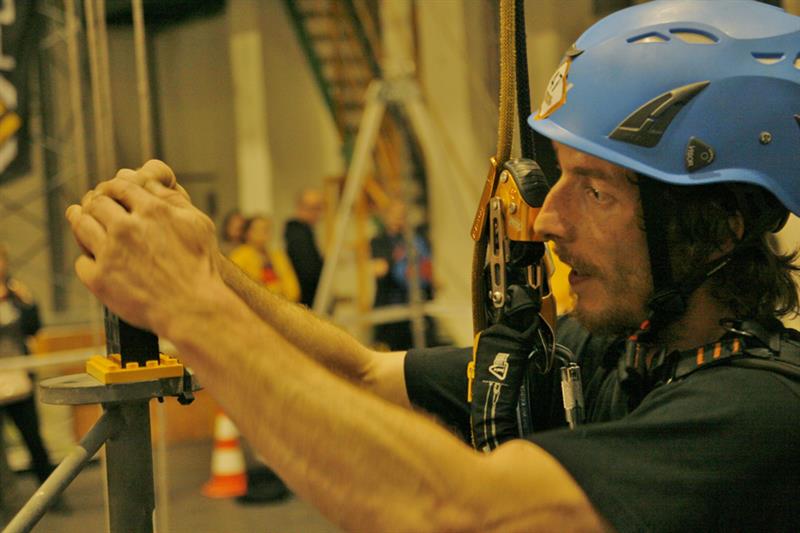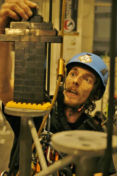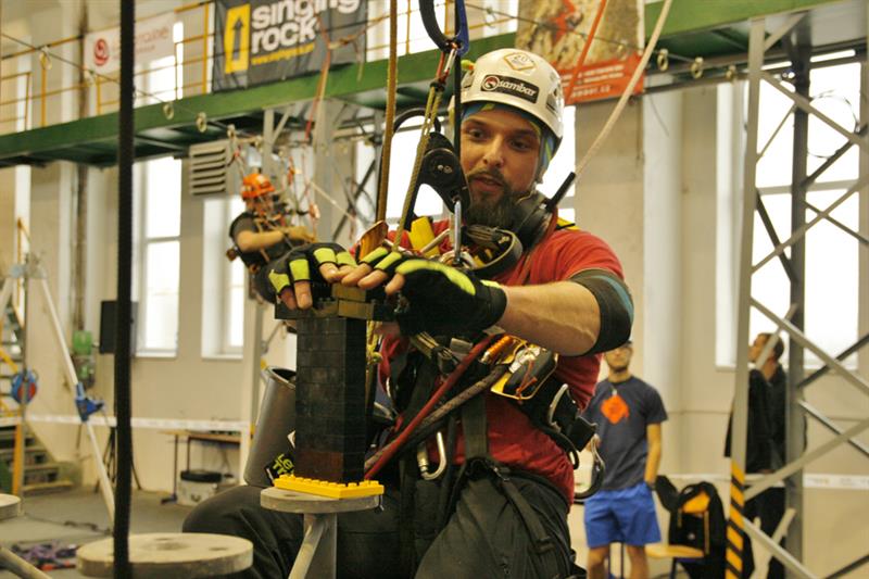 The second task, Lego, tested a set of different skills and abilities, to name one: to transfer from one part of the climbing area to the other, competitors had to use aid-climbing using points on a wire rope. The task here was to collect Lego Duplo bricks from the ground, without touching the ground and using long re-belay transfer back to the other side of the area and there built an arrow from the Lego bricks, the same which is in the logo of Singing Rock.