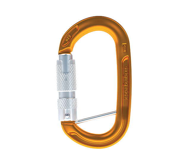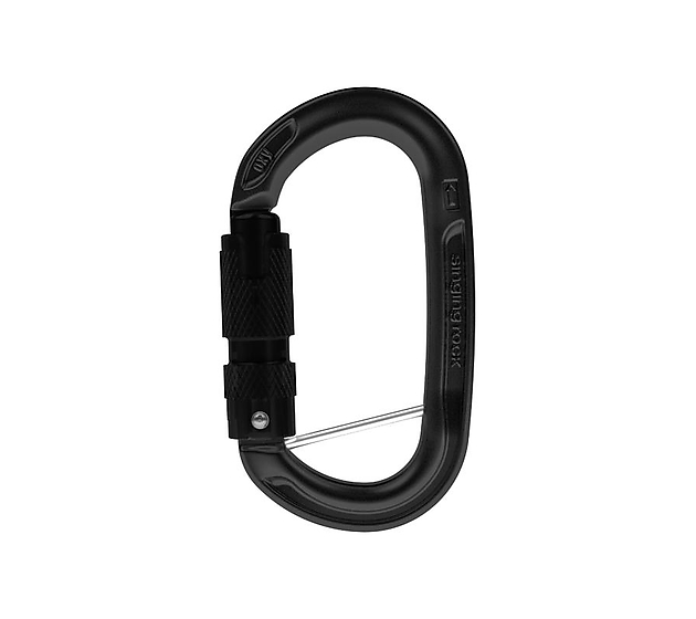 Hot-forged light alloy oval carabiner with a removable captive bar.