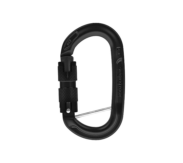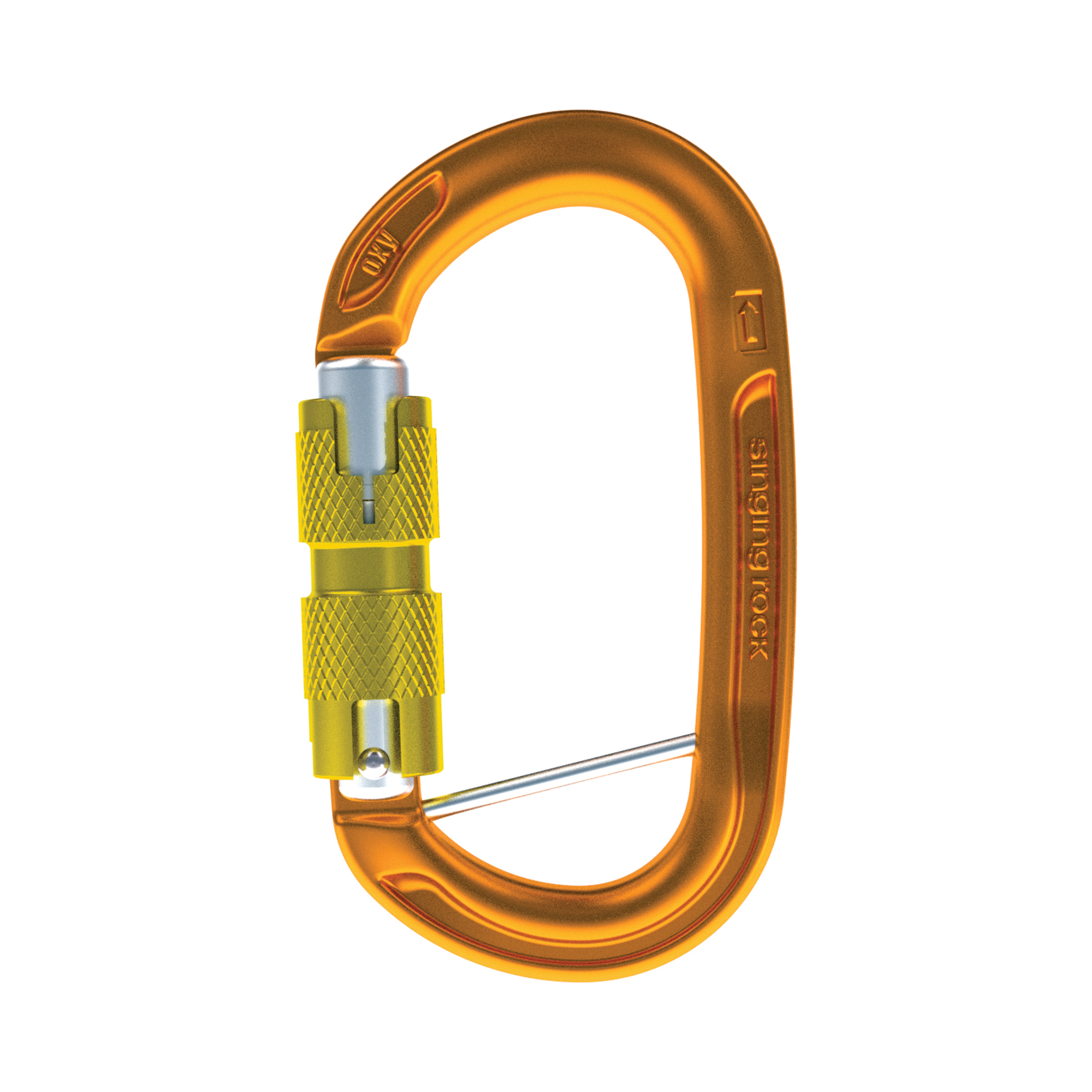 Hot-forged light alloy oval carabiner with a removable captive bar.