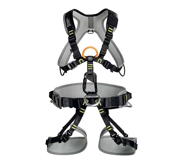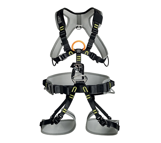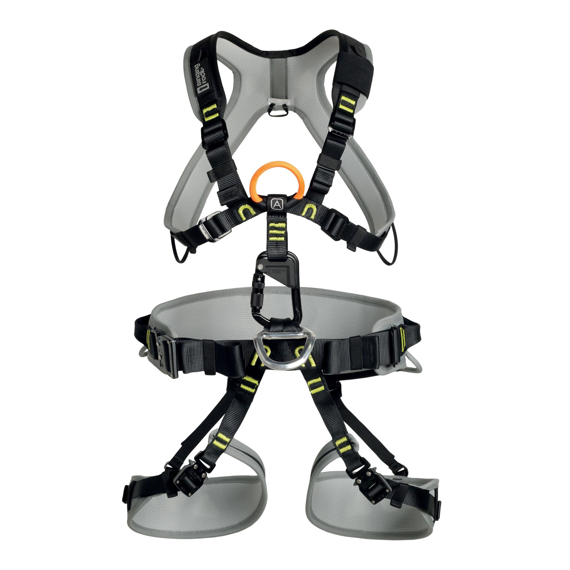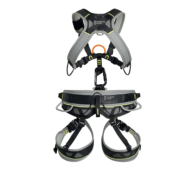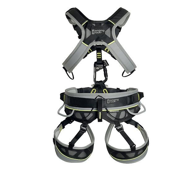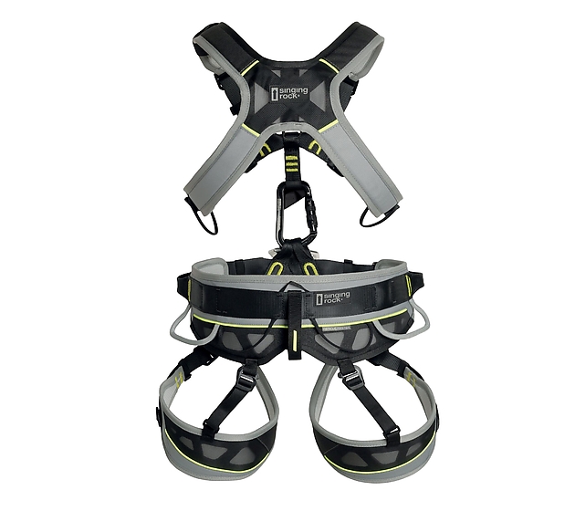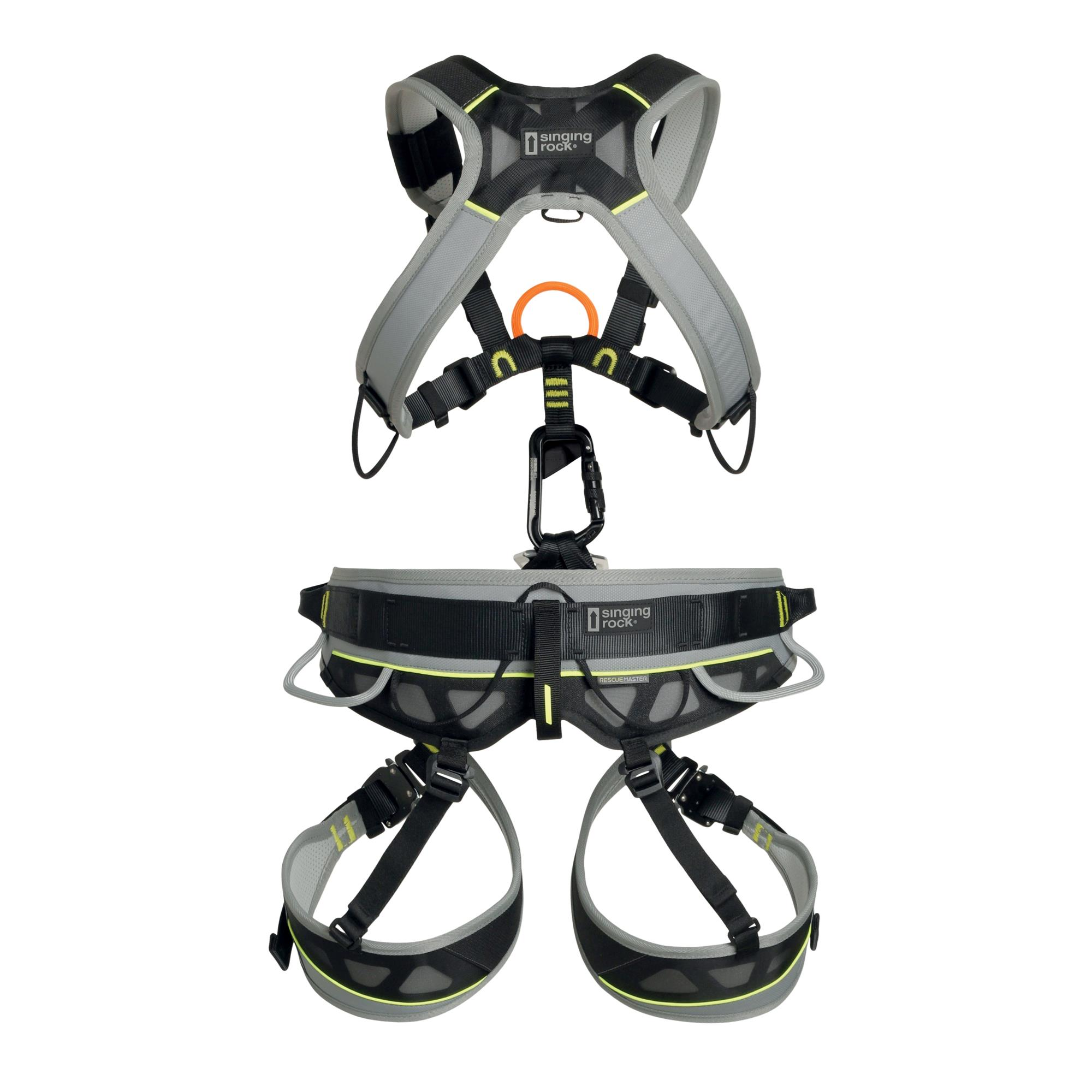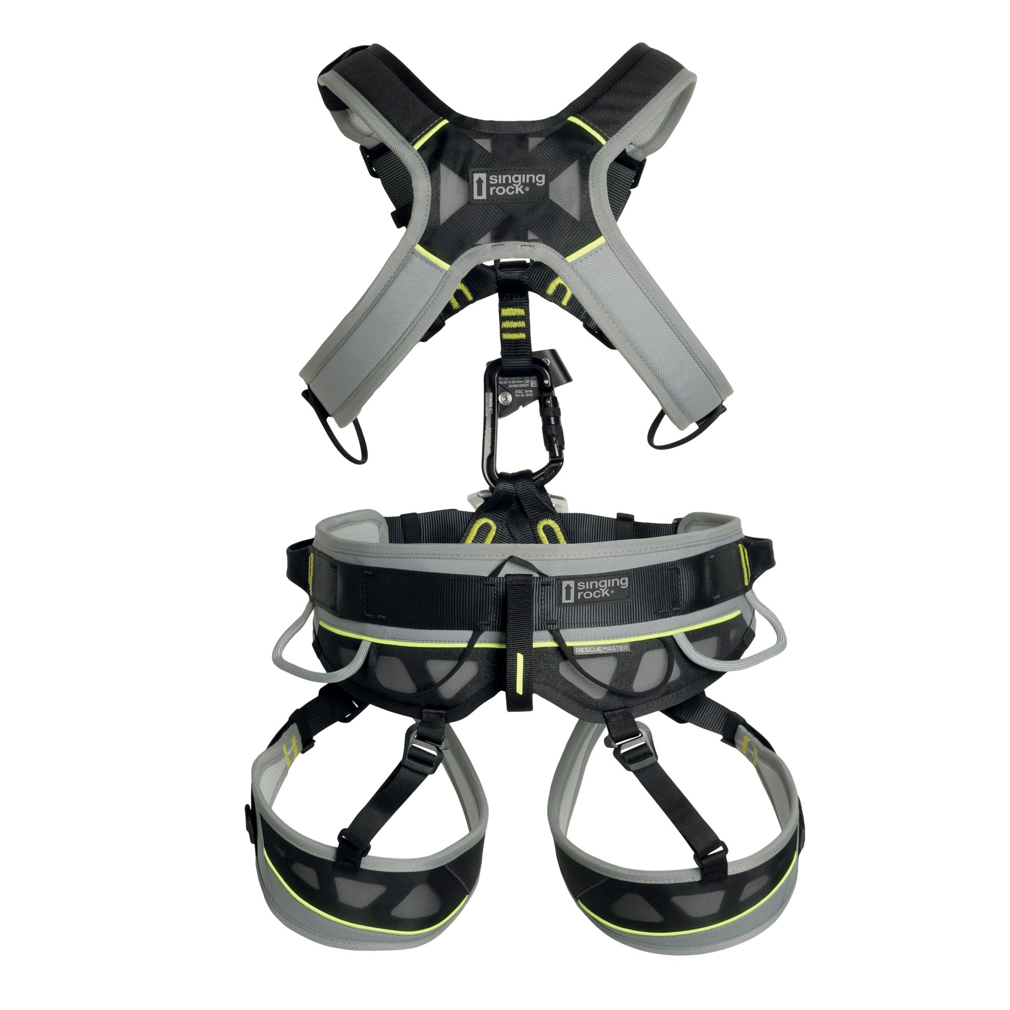 Harness for rescuers with comfortable, lightweight and breathable padding, designed for easy movement on the ground and efficient work at height. The chest part can be detached and the sit harness can be used separately if needed. The carabiner connecting the chest and sit parts allows easy integration of a chest ascender. RESCUE MASTER provides maximum reliability and versatility for rescuers operating in climbing, exposed or otherwise inaccessible terrain, using rope techniques, rappelling from helicopters or flying suspended underneath.