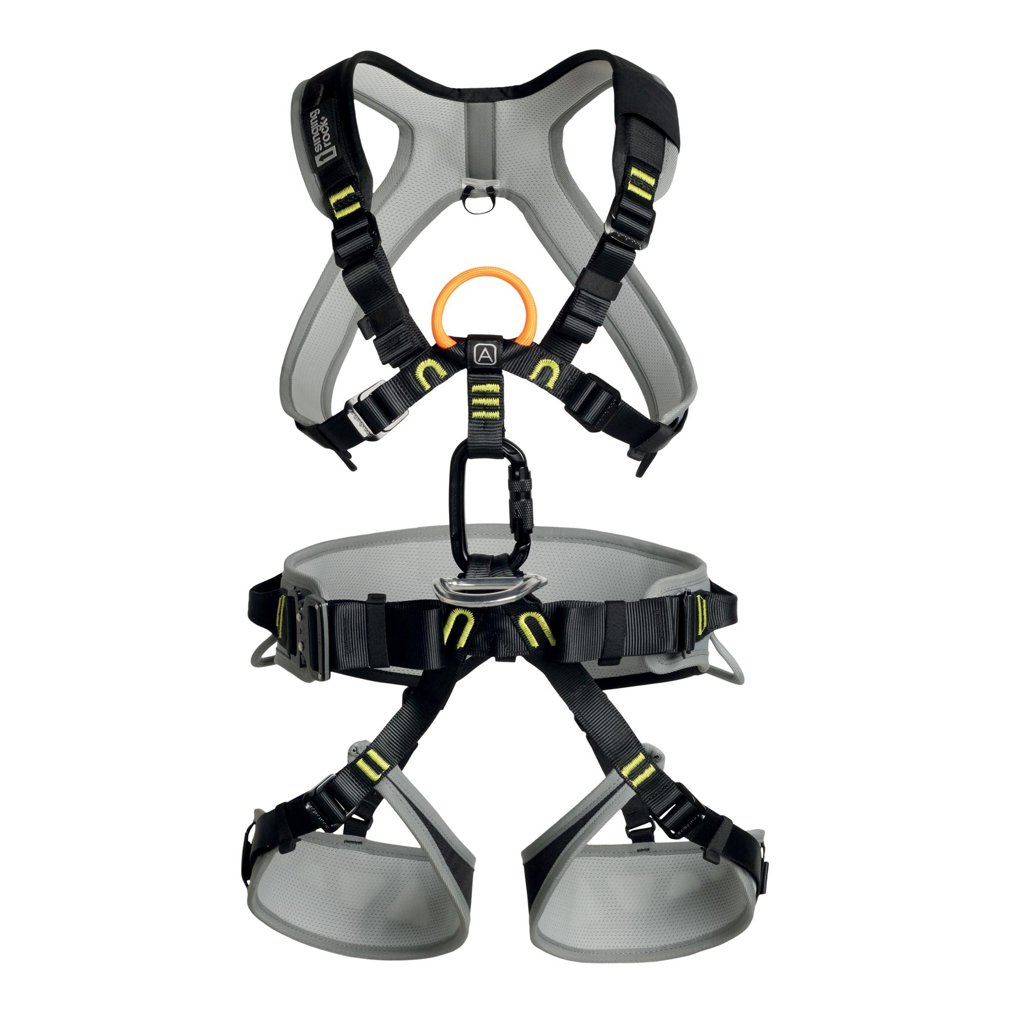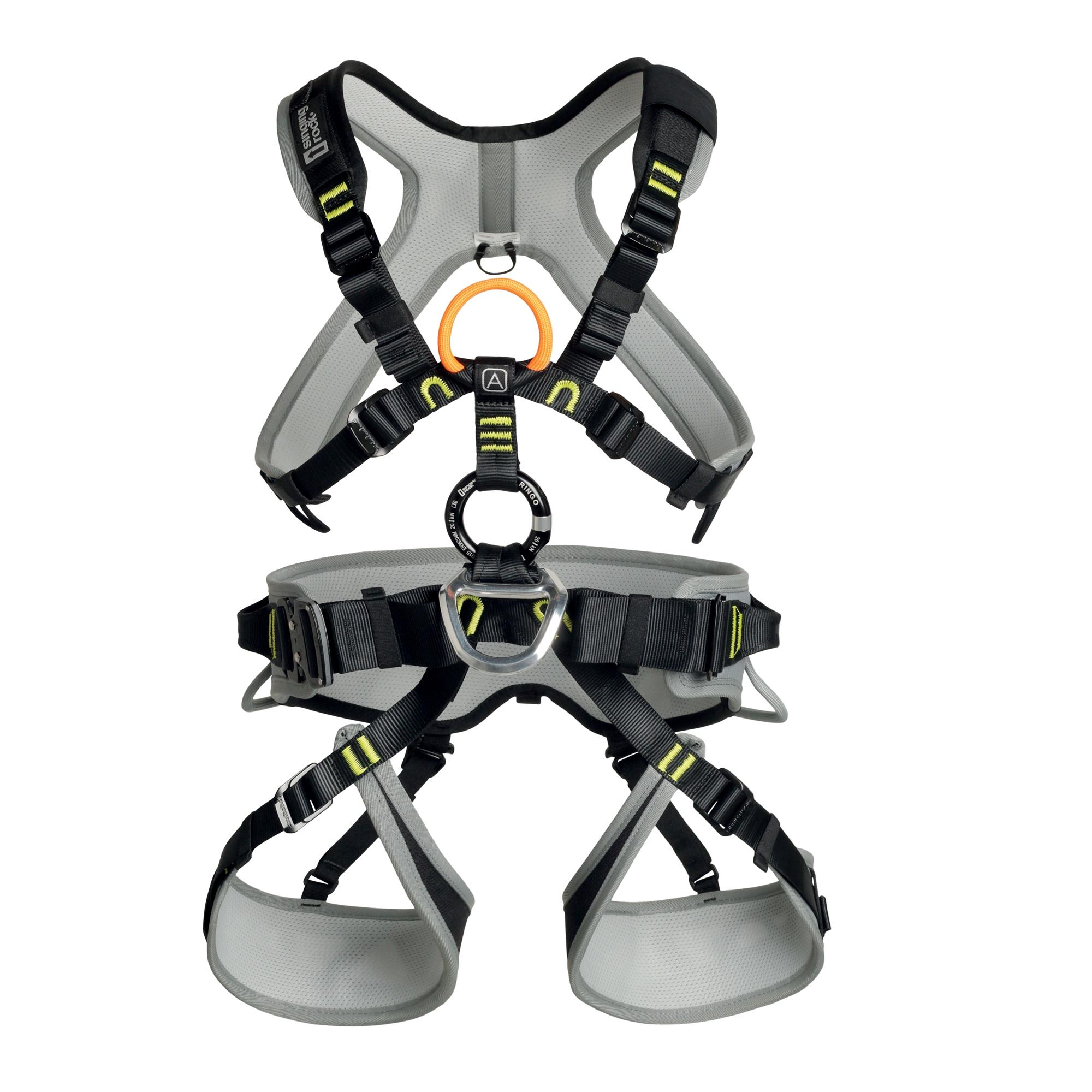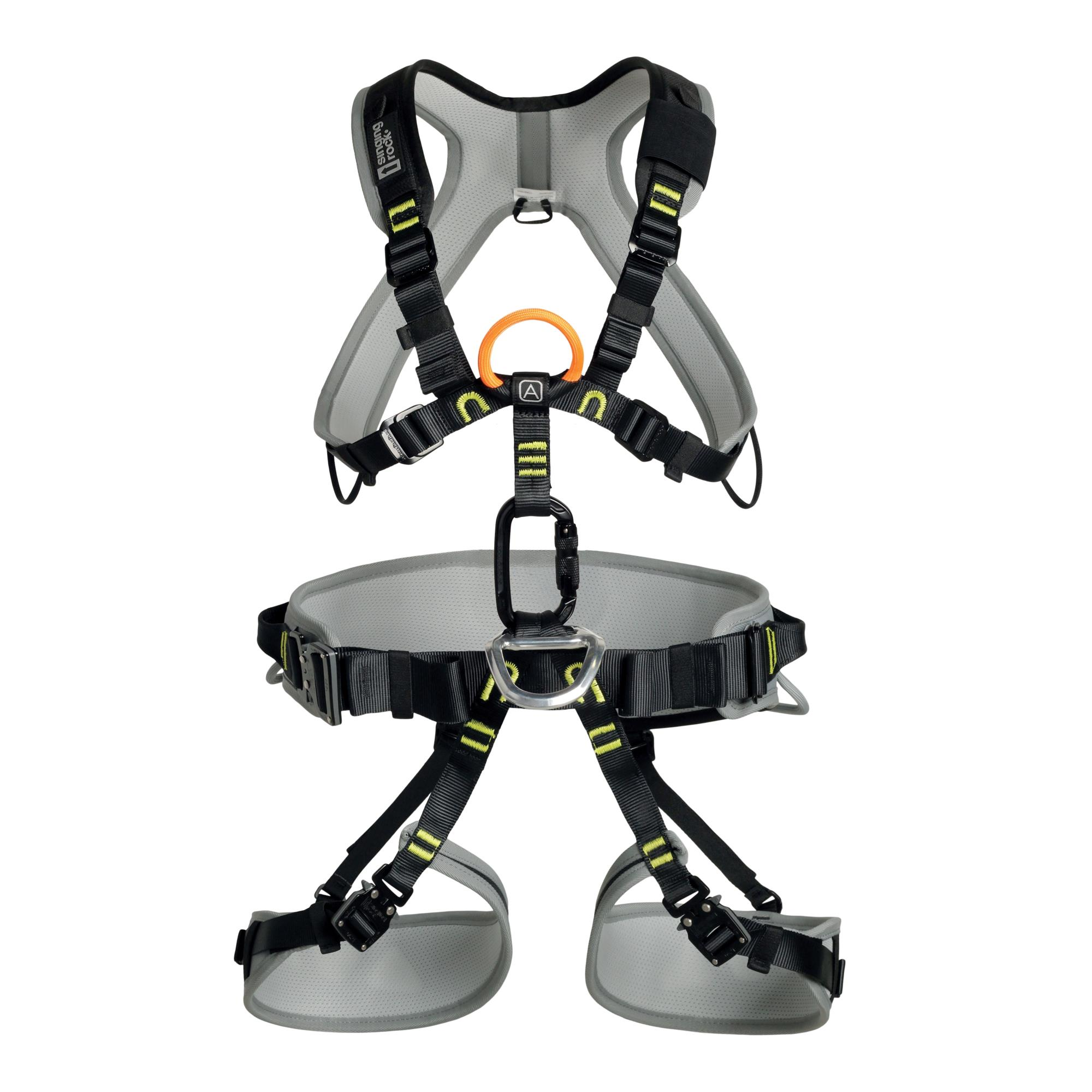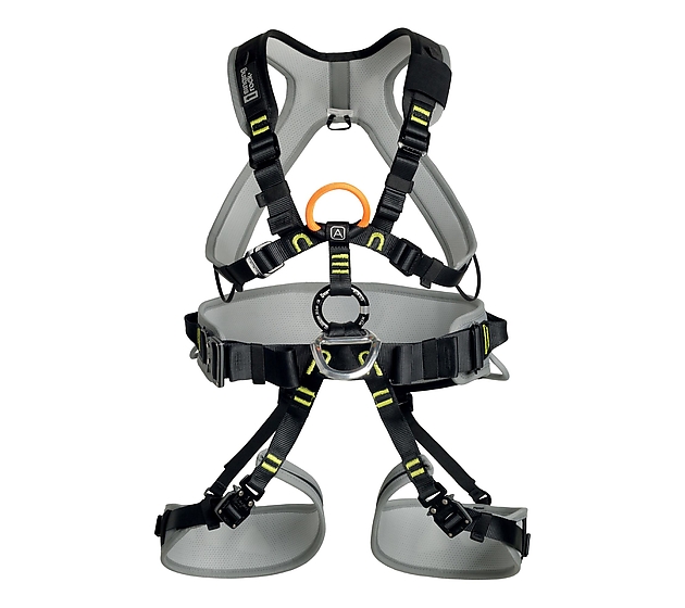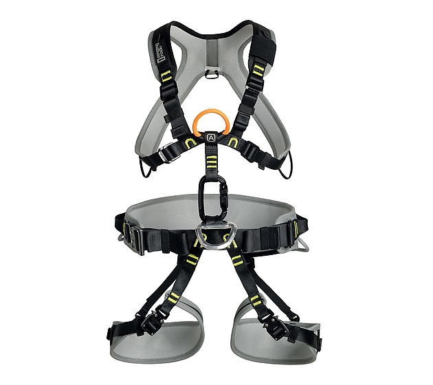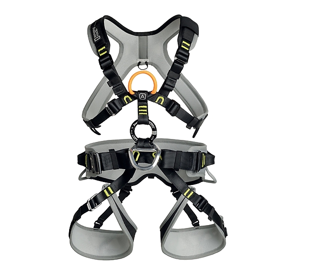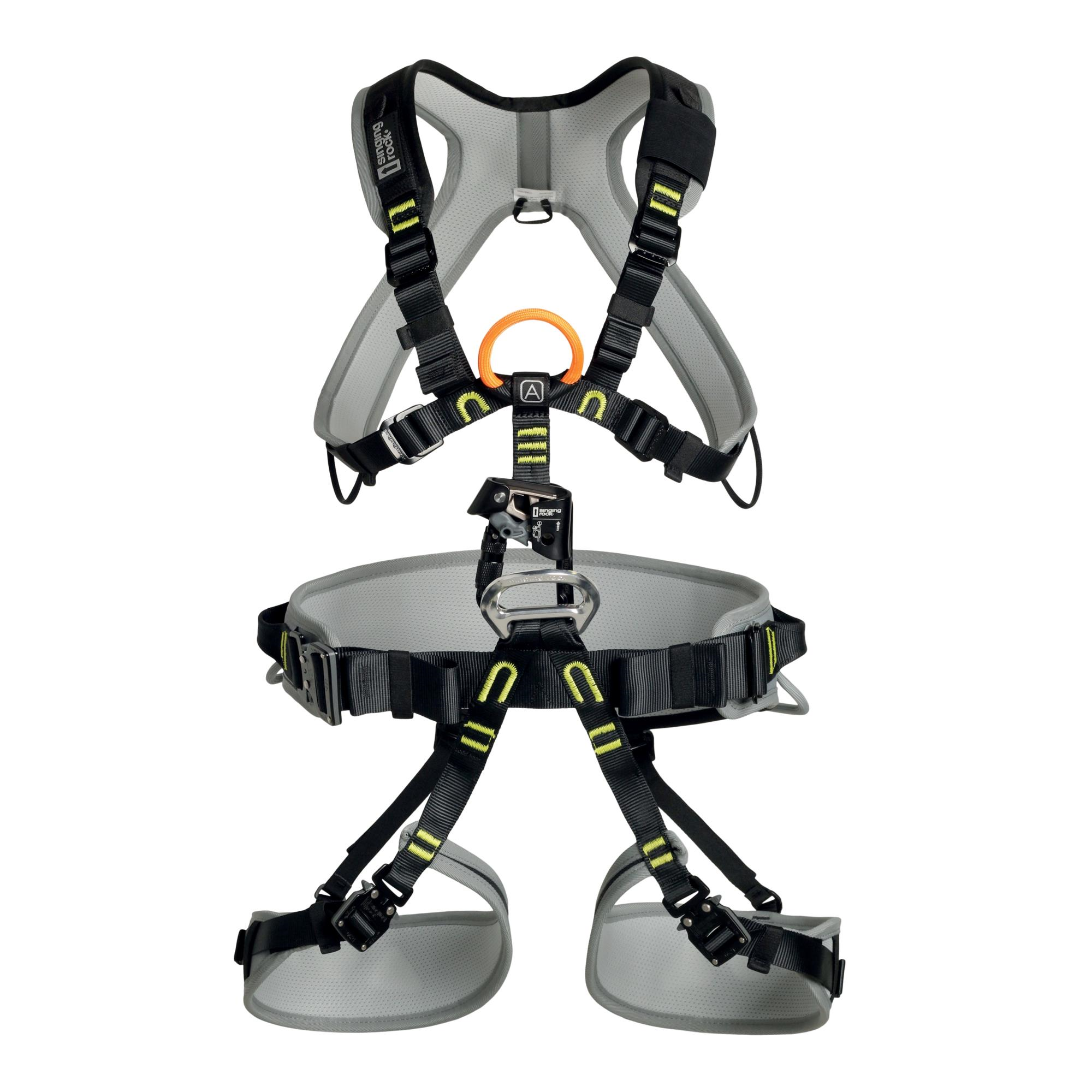 Harness for rescuers with comfortable, lightweight and breathable padding, designed for easy movement on the ground and efficient work at height. The chest part can be detached and the sit harness can be used separately if needed. The carabiner connecting the chest and sit parts allows easy integration of a chest ascender. RESCUE MASTER provides maximum reliability and versatility for rescuers operating in climbing, exposed or otherwise inaccessible terrain, using rope techniques, rappelling from helicopters or flying suspended underneath.