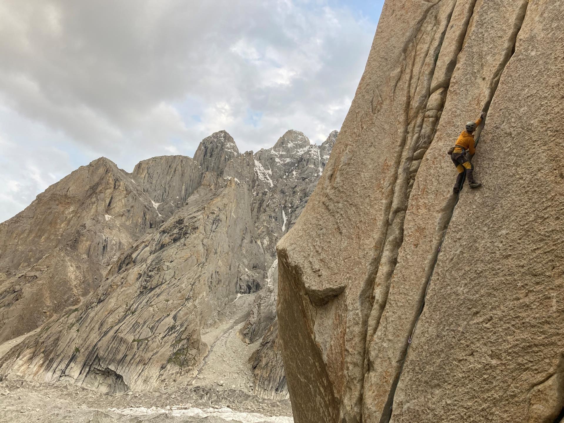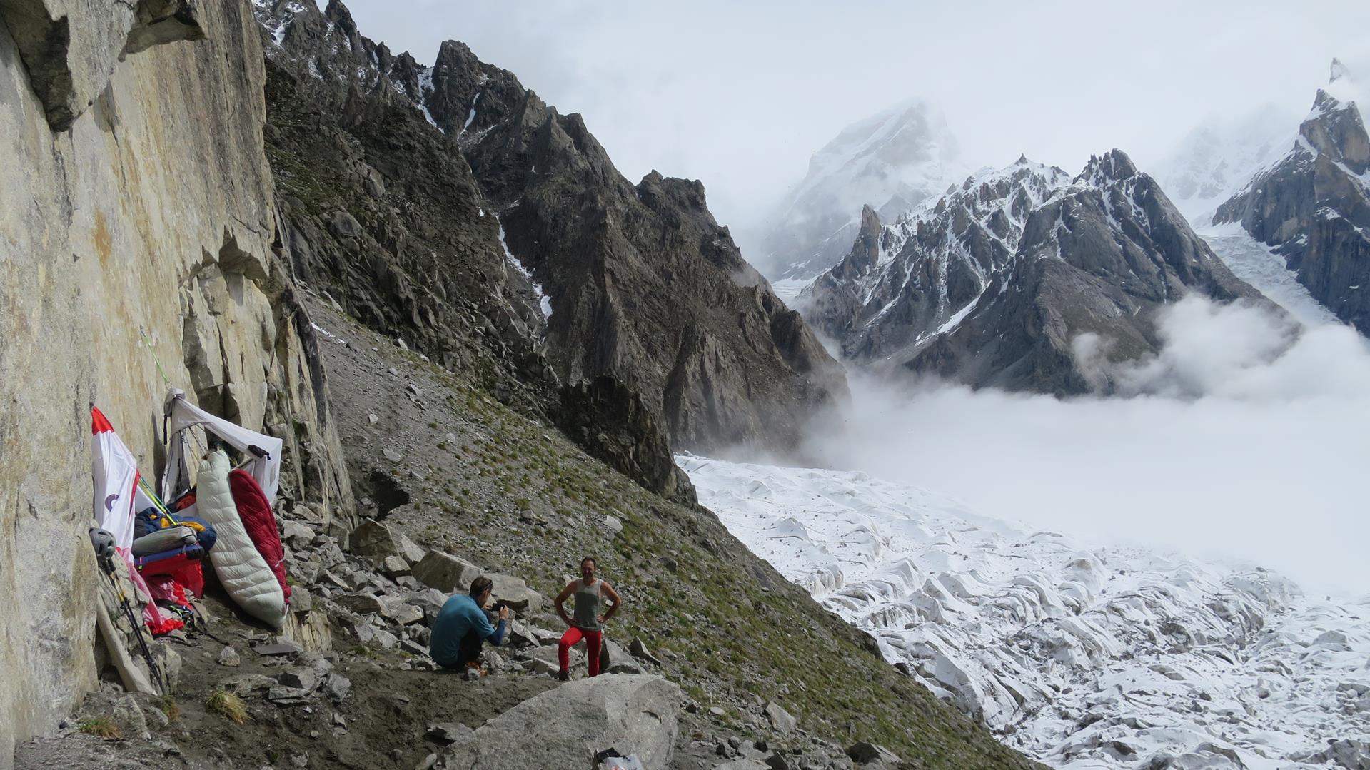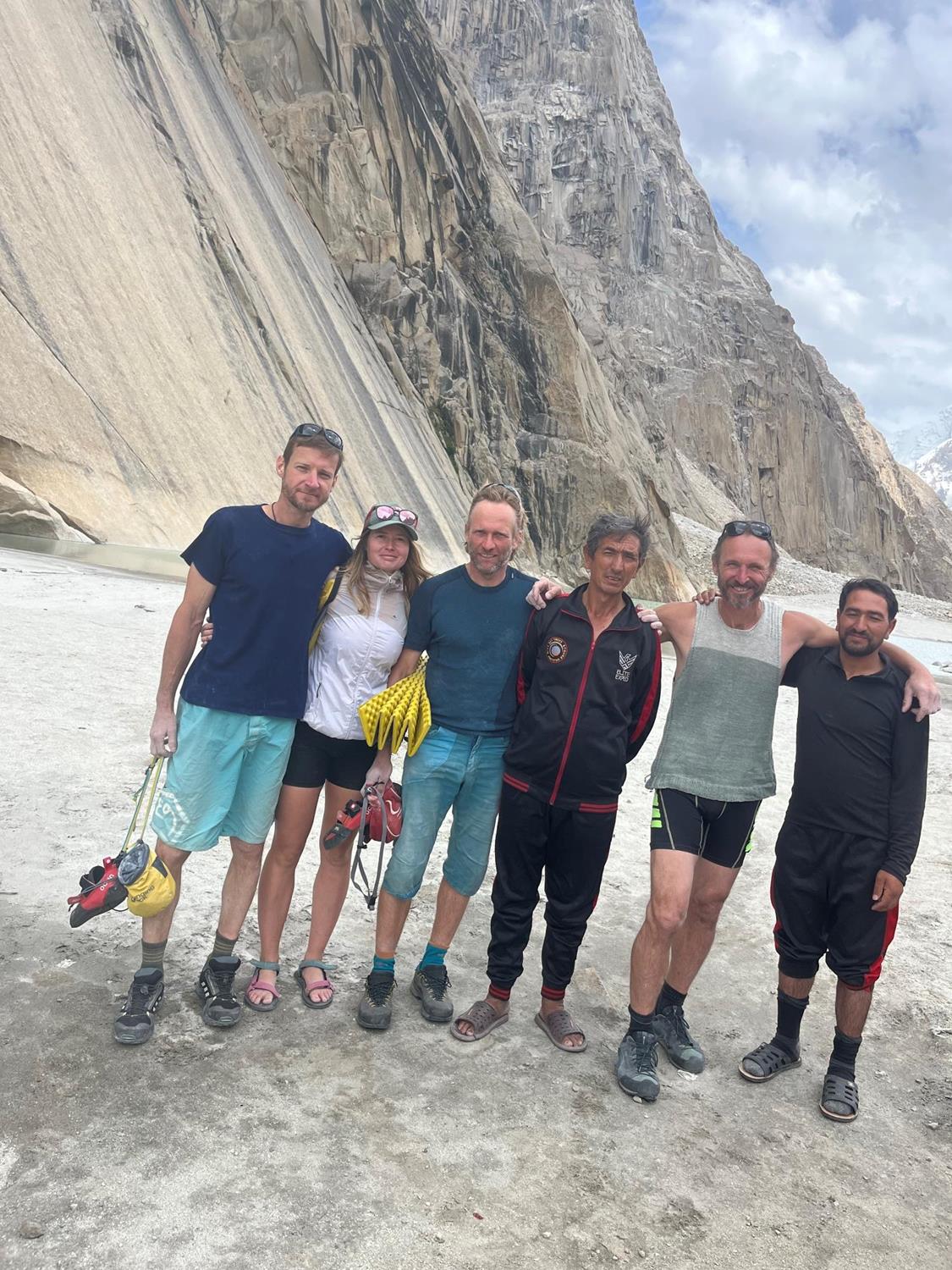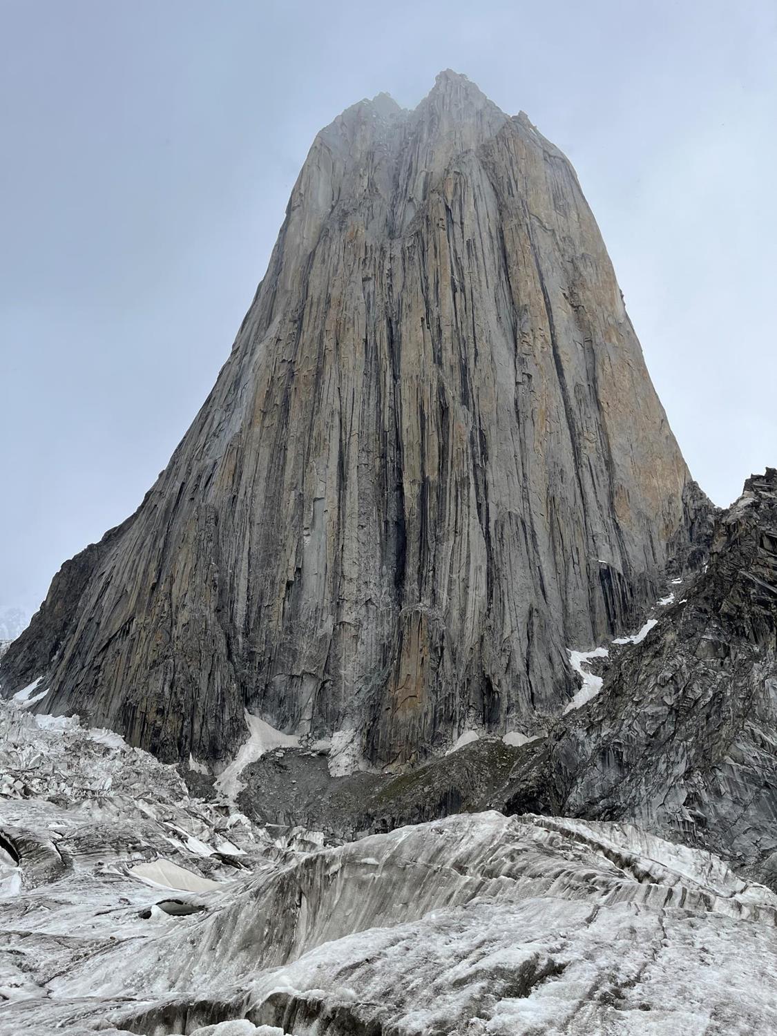 Later, when he sent me a photo of our planned wall, the eastern face of Shipton Spire, I was thrilled.. A perfect granite obelisk. My confidence wavered, though, when I saw the second image - the topo of the Women and Chalk route. The first 8a above 5000m, one of the most challenging multipitch routes in the world at the time of its first ascent in 2001. Over 1000m of rock where the difficulty rarely drops below 7a. The Italian team, led by Mauro Bollé, took a direct line straight up the wall to the summit ridge, from where they rappelled after 20 days. The route was repeated in 2006. The Austrian team, led by Hansjörg Auer, fought their way up the ridge and followed the Ship of Fools route for 8 more lengths to the summit. Since then, nothing.