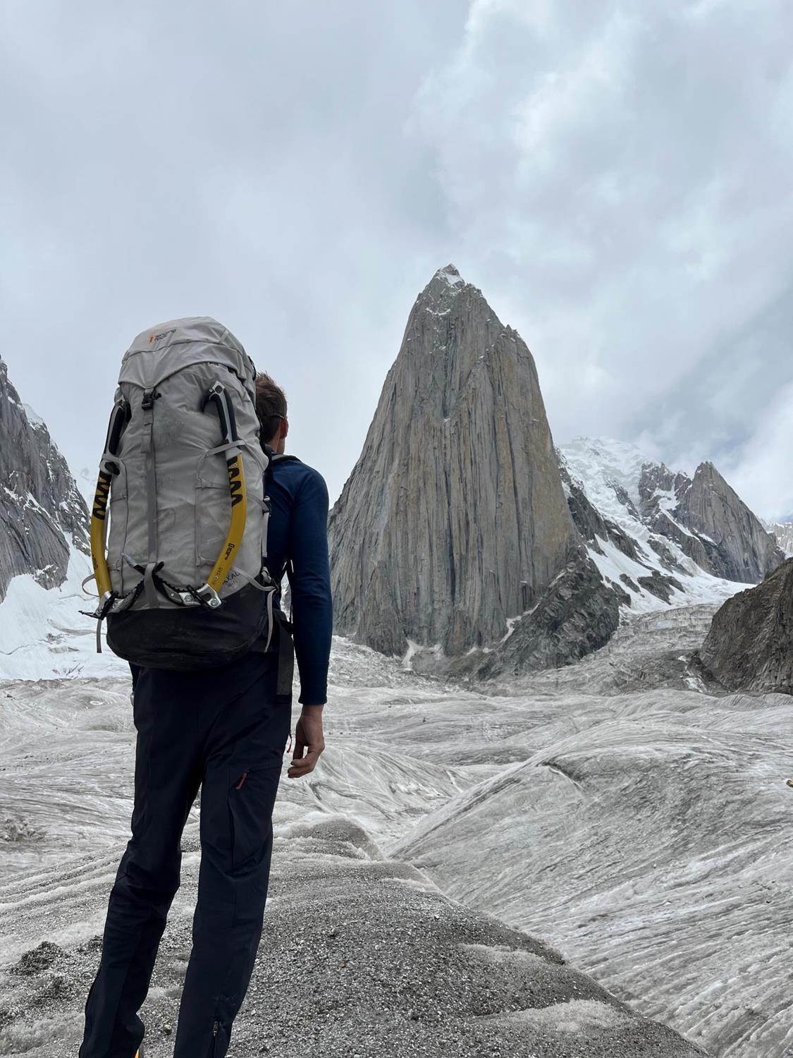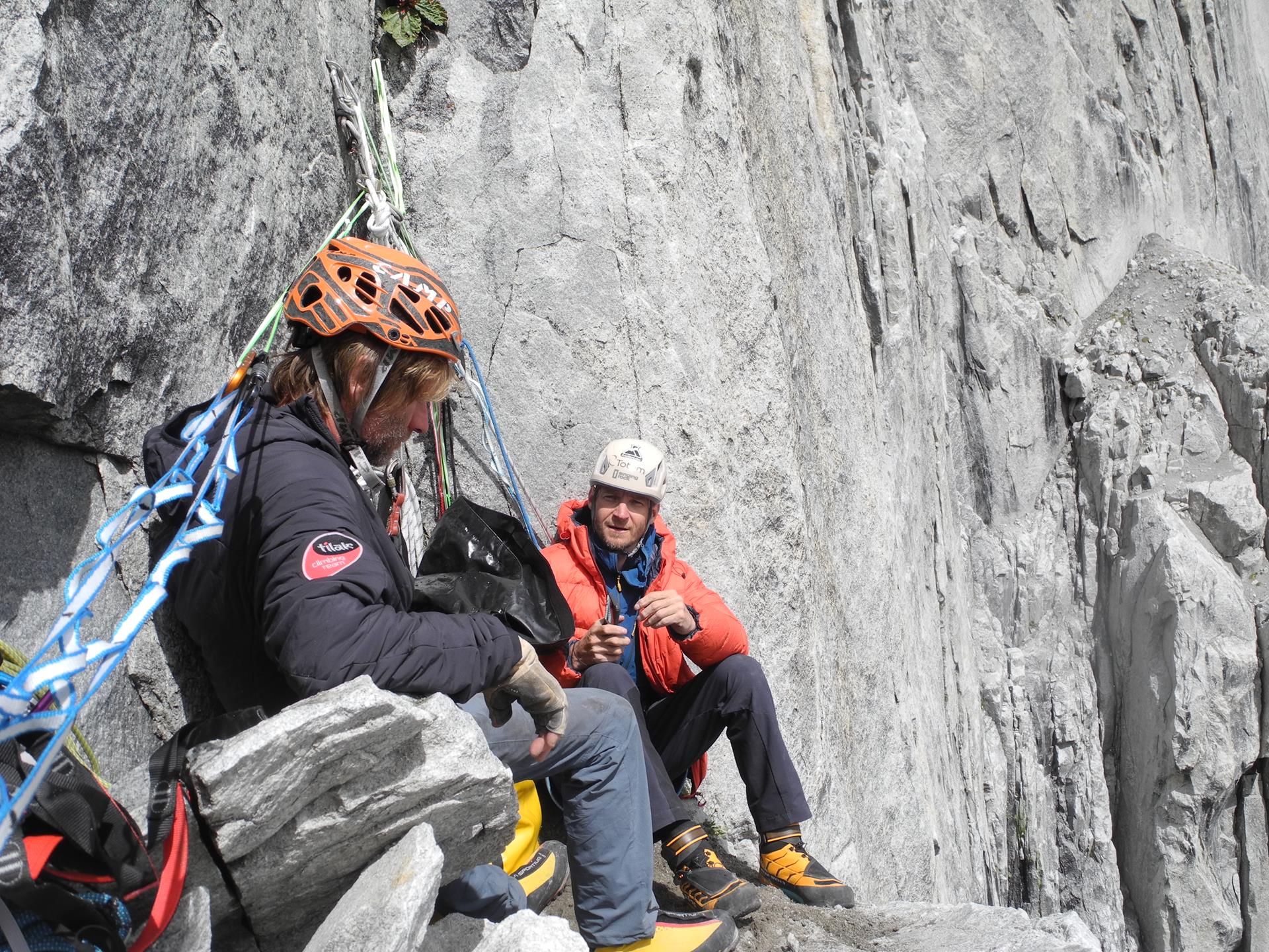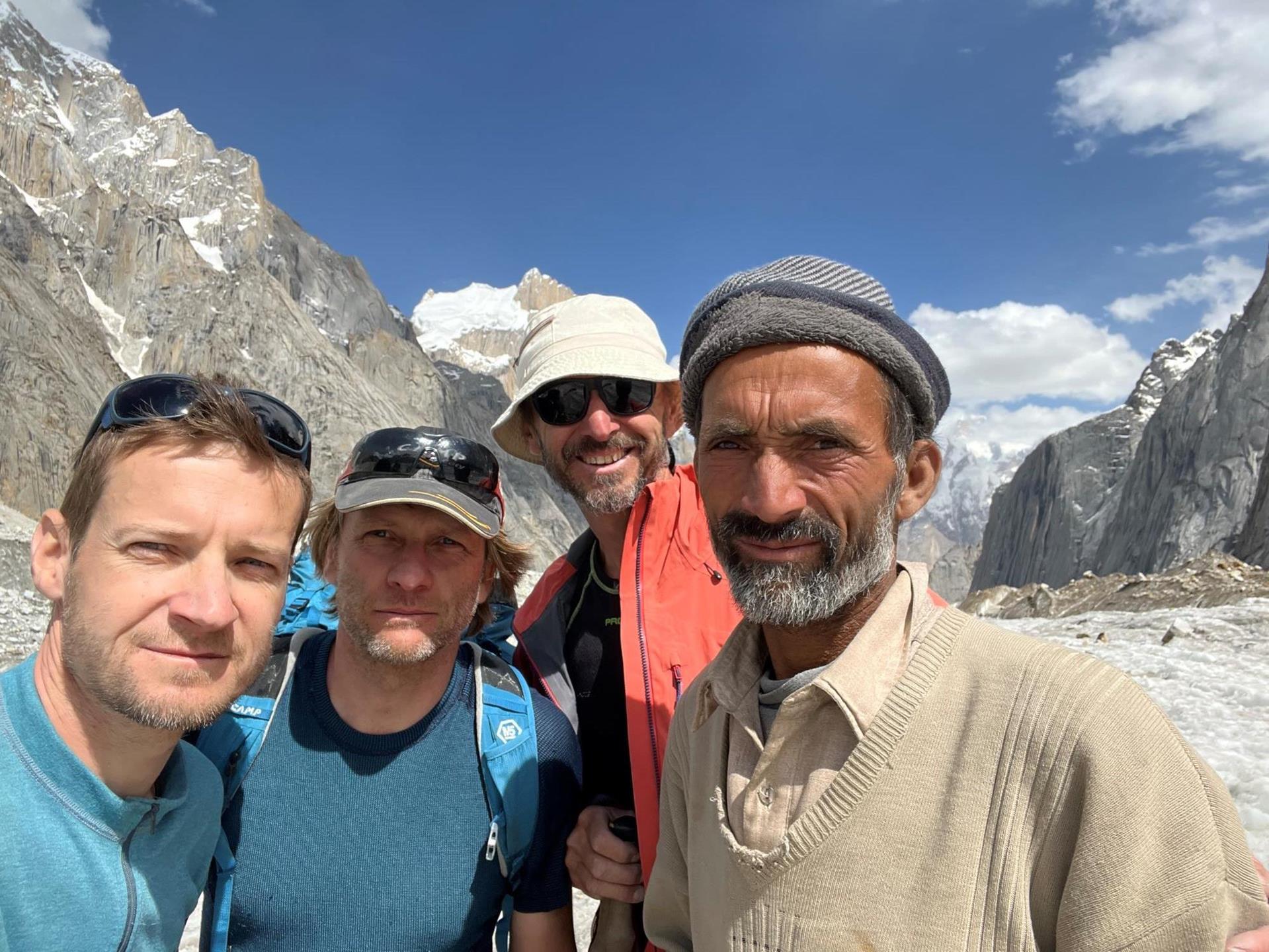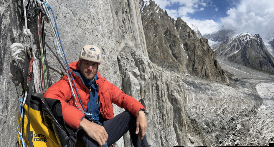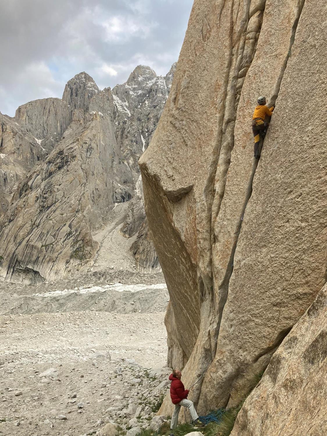 Later, when he sent me a photo of our planned wall, the eastern face of Shipton Spire, I was thrilled.. A perfect granite obelisk. My confidence wavered, though, when I saw the second image - the topo of the Women and Chalk route. The first 8a above 5000m, one of the most challenging multipitch routes in the world at the time of its first ascent in 2001. Over 1000m of rock where the difficulty rarely drops below 7a. The Italian team, led by Mauro Bollé, took a direct line straight up the wall to the summit ridge, from where they rappelled after 20 days. The route was repeated in 2006. The Austrian team, led by Hansjörg Auer, fought their way up the ridge and followed the Ship of Fools route for 8 more lengths to the summit. Since then, nothing.