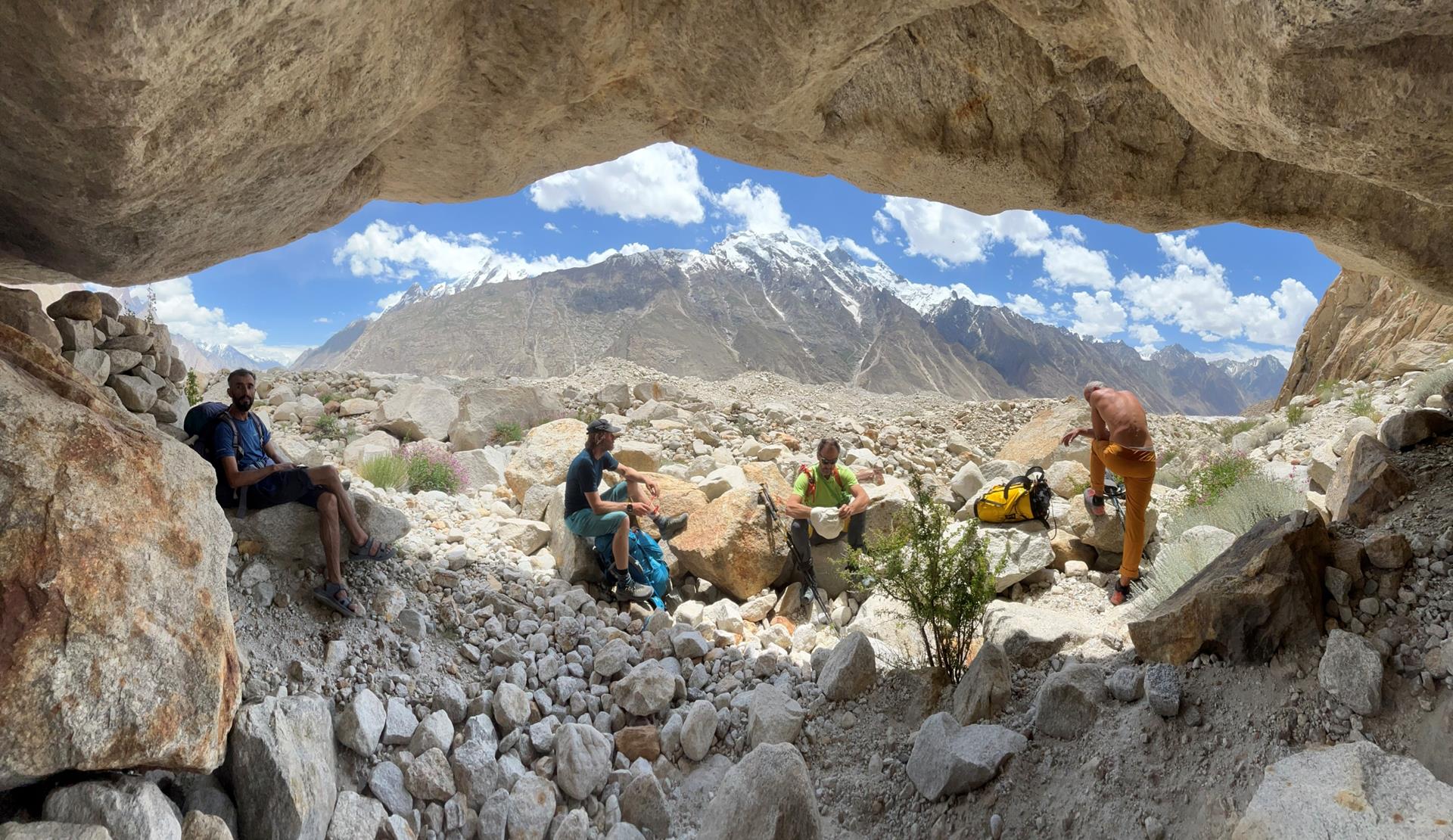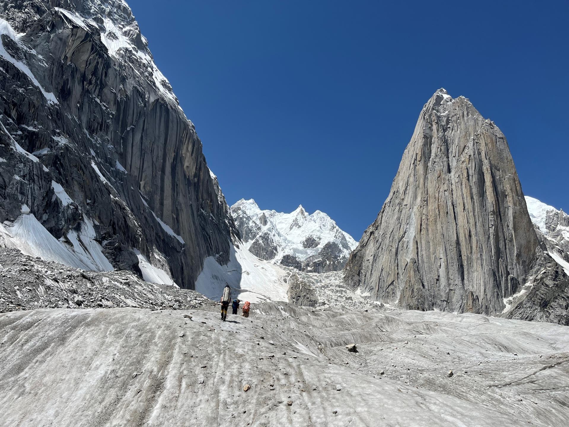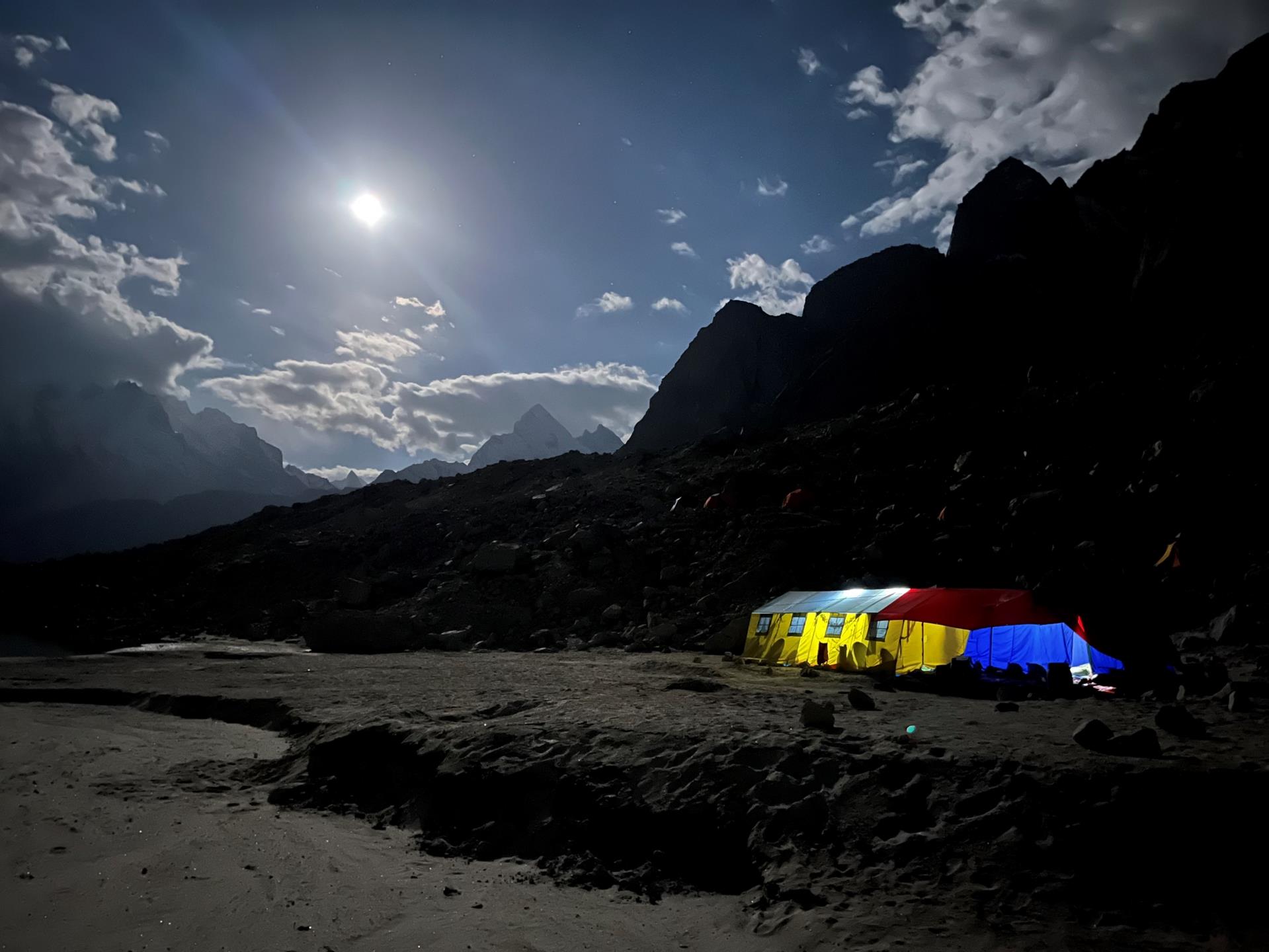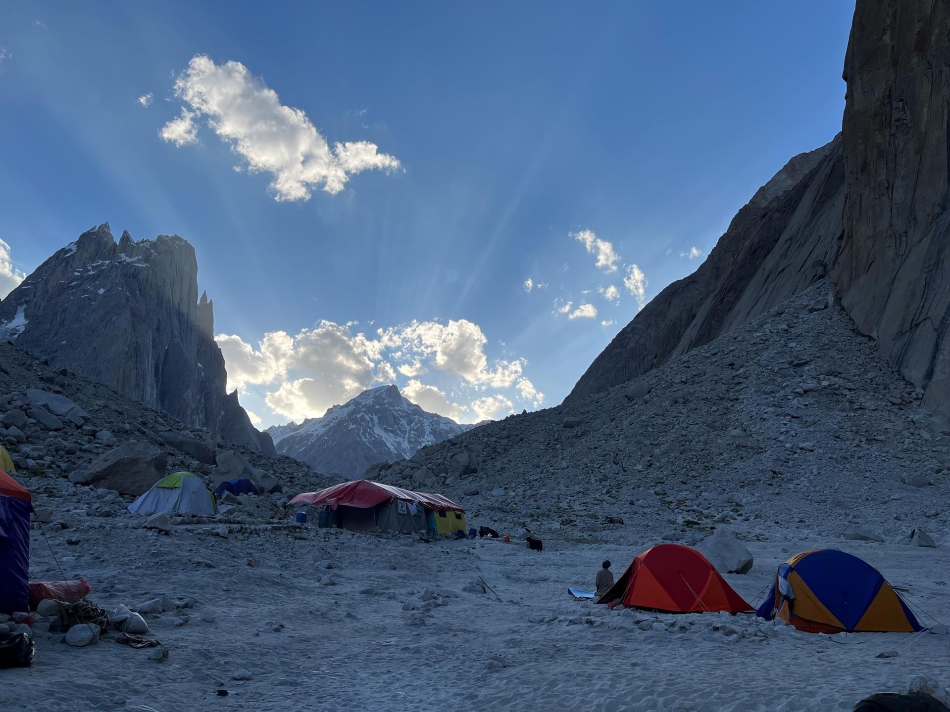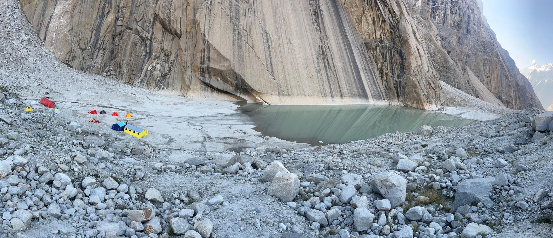 We shared the BC below Great Trango with a group of strong climbers from Czechia and Slovakia. From BC, we trekked four hours over the broken Trango Glacier to reach our ABC near Shipton, located on a beautiful alpine meadow. From there, it was another five hours over an even rougher glacier to the base of the wall. We set up C1 at the foot of the wall under a rock overhang, just 5 minutes to the wall. This whole journey took us 14 long days from Prague. We have 10 days to climb, descend and return to the airport in about 6 days. Time was unforgiving.