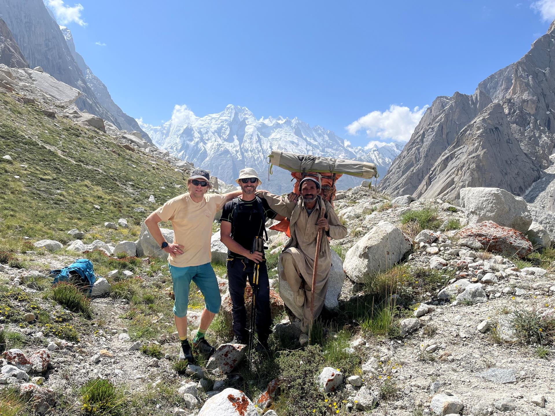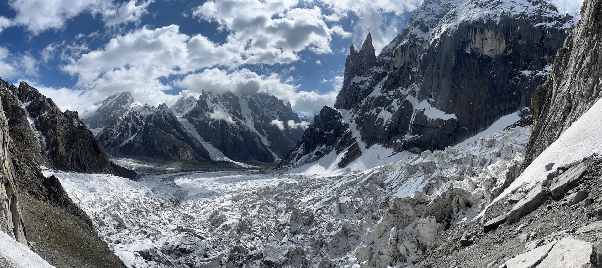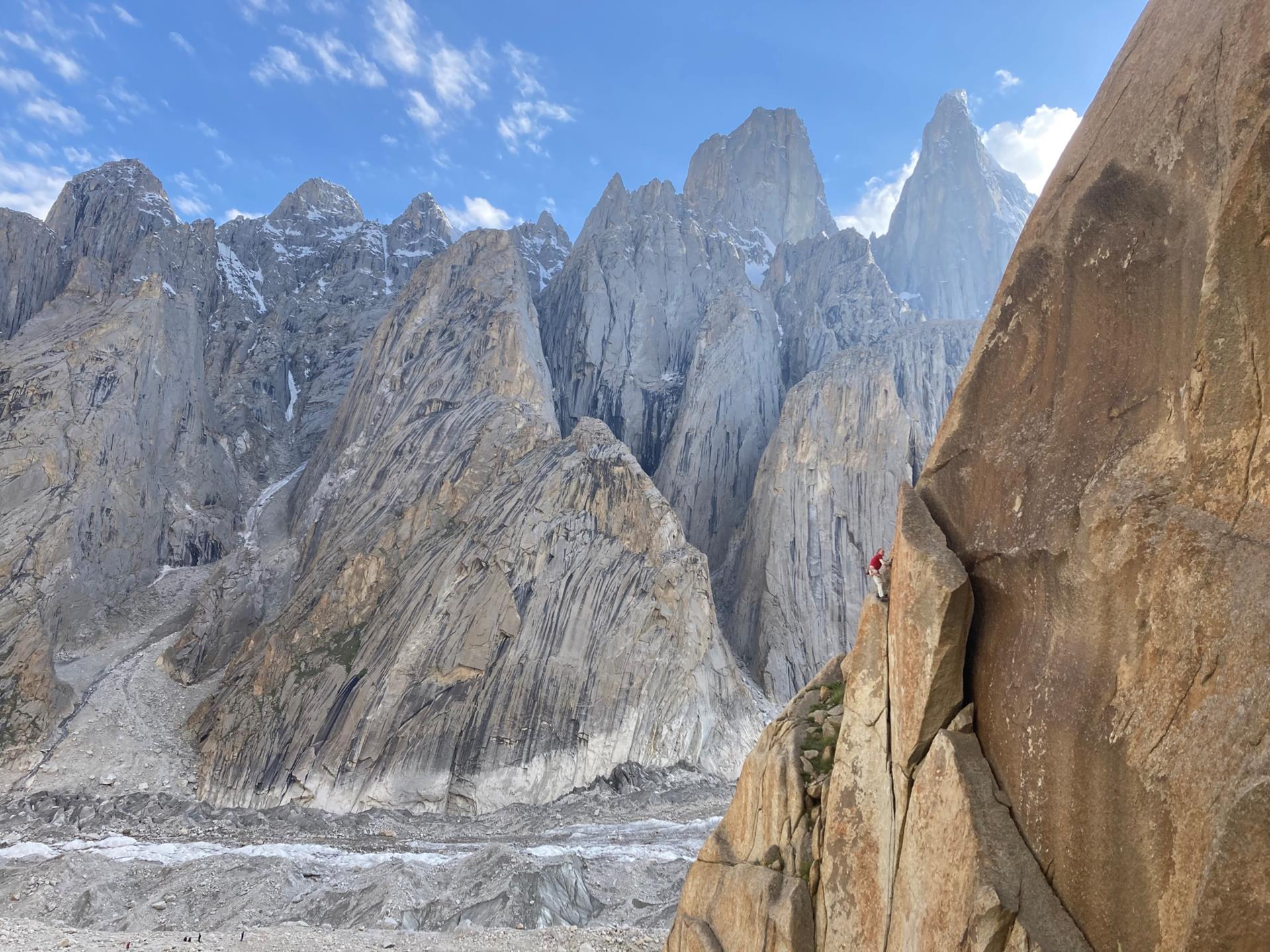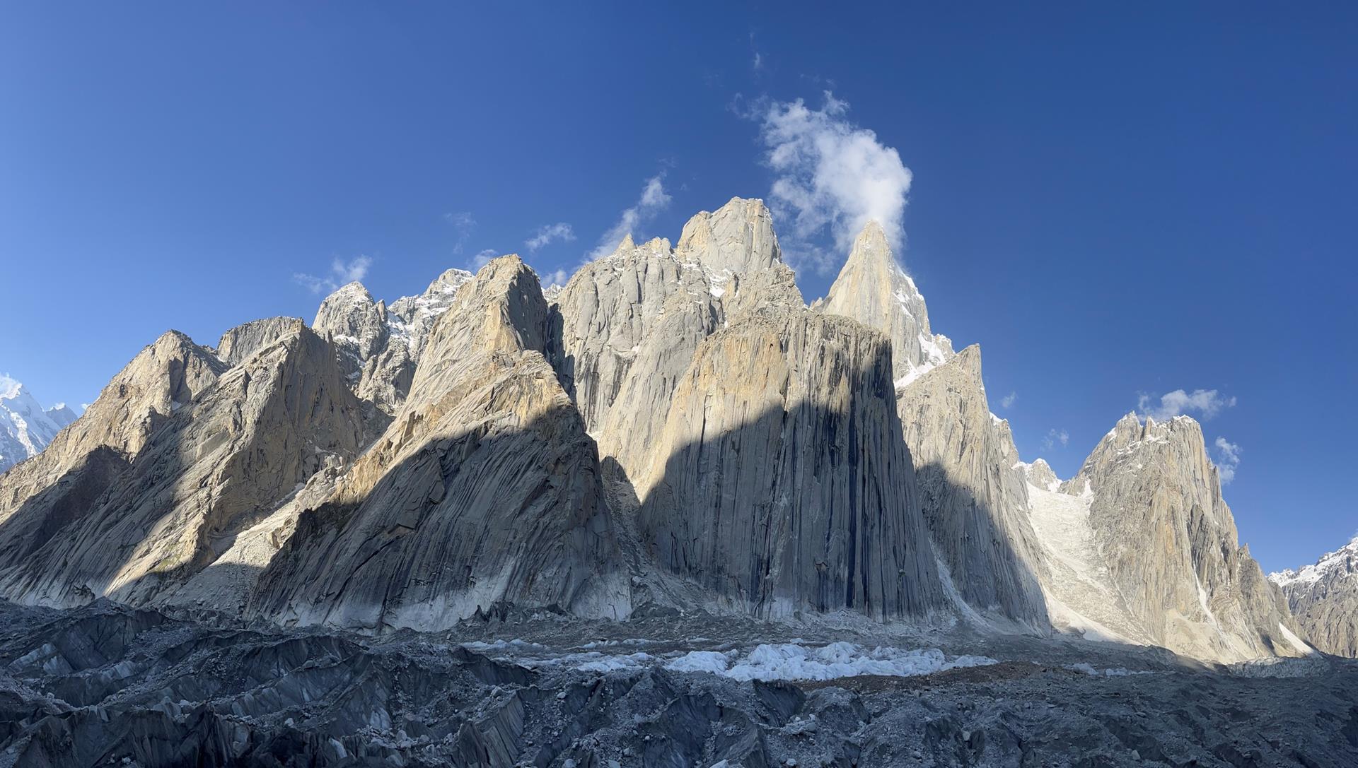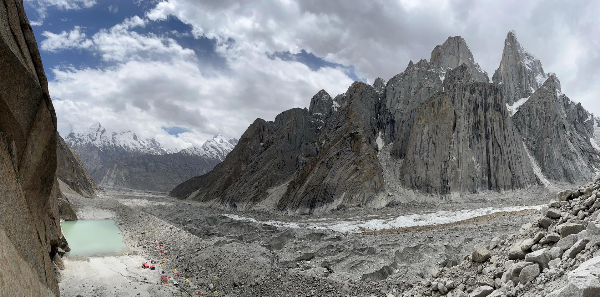 We shared the BC below Great Trango with a group of strong climbers from Czechia and Slovakia. From BC, we trekked four hours over the broken Trango Glacier to reach our ABC near Shipton, located on a beautiful alpine meadow. From there, it was another five hours over an even rougher glacier to the base of the wall. We set up C1 at the foot of the wall under a rock overhang, just 5 minutes to the wall. This whole journey took us 14 long days from Prague. We have 10 days to climb, descend and return to the airport in about 6 days. Time was unforgiving.
