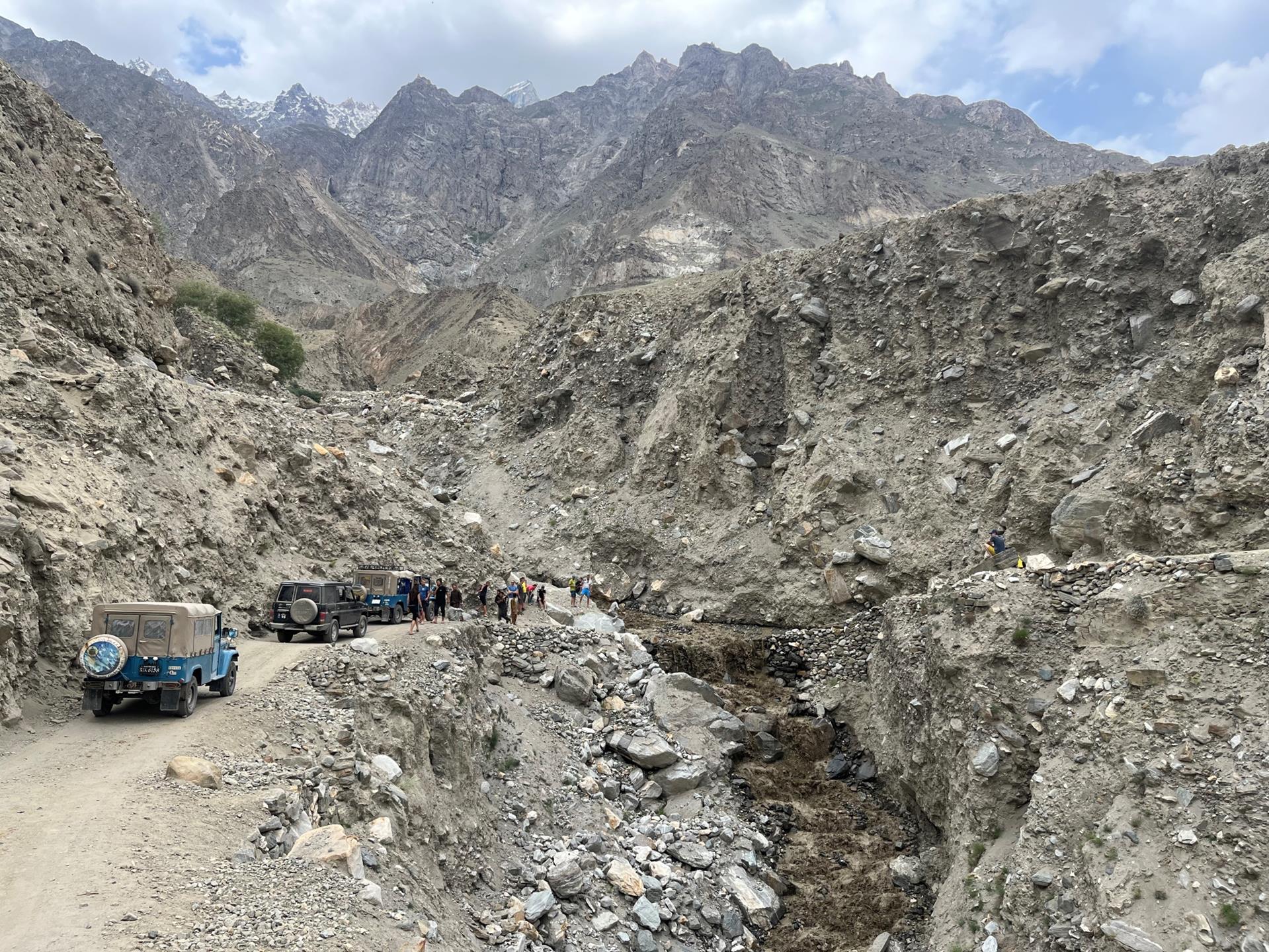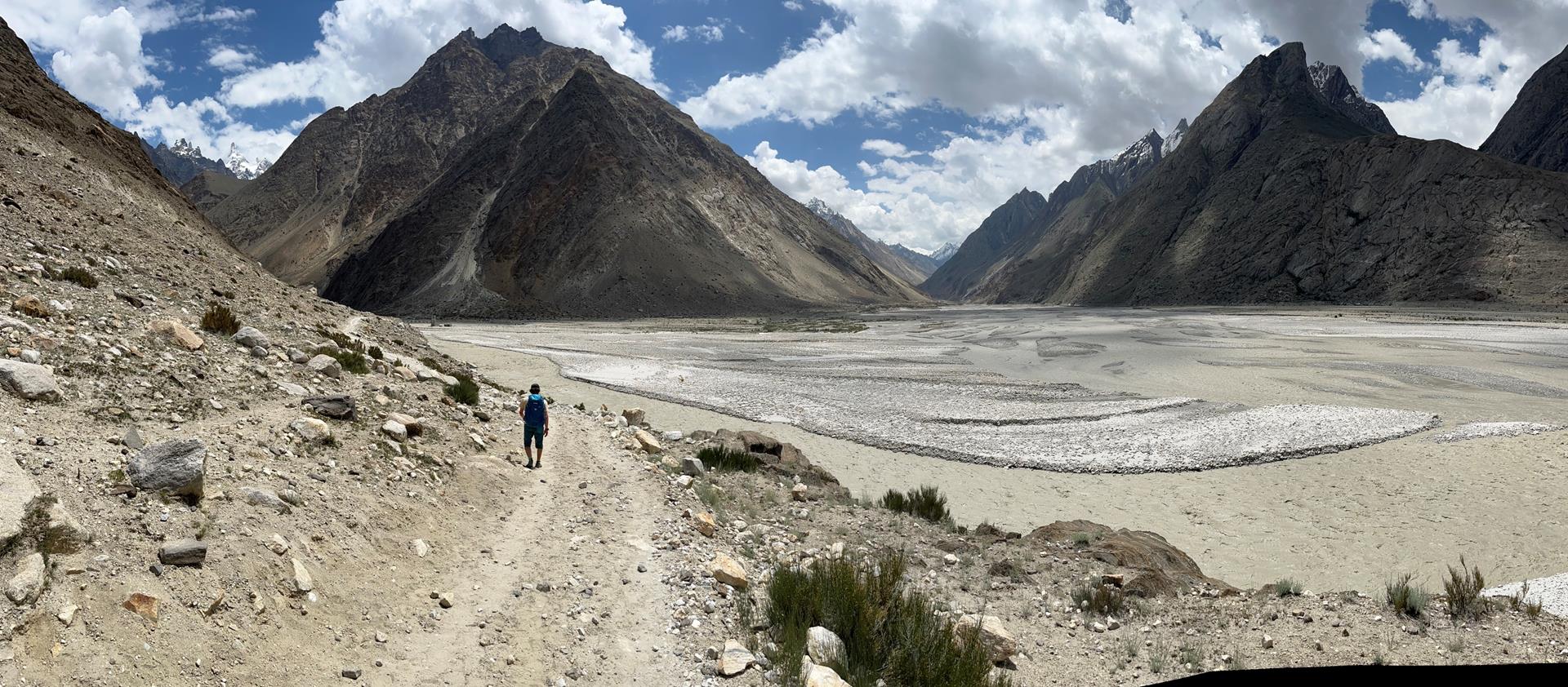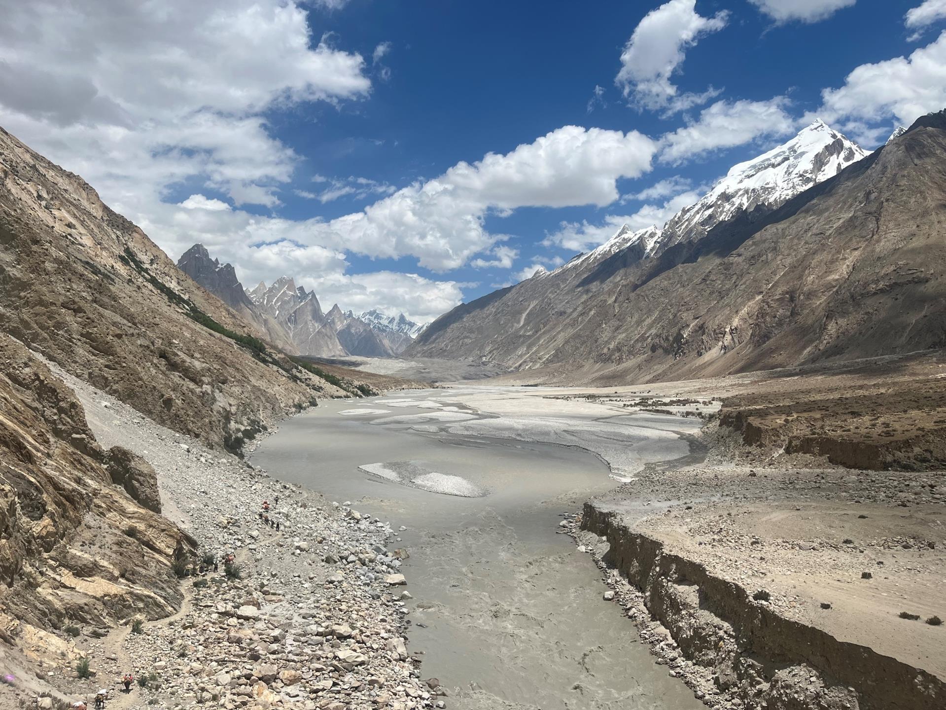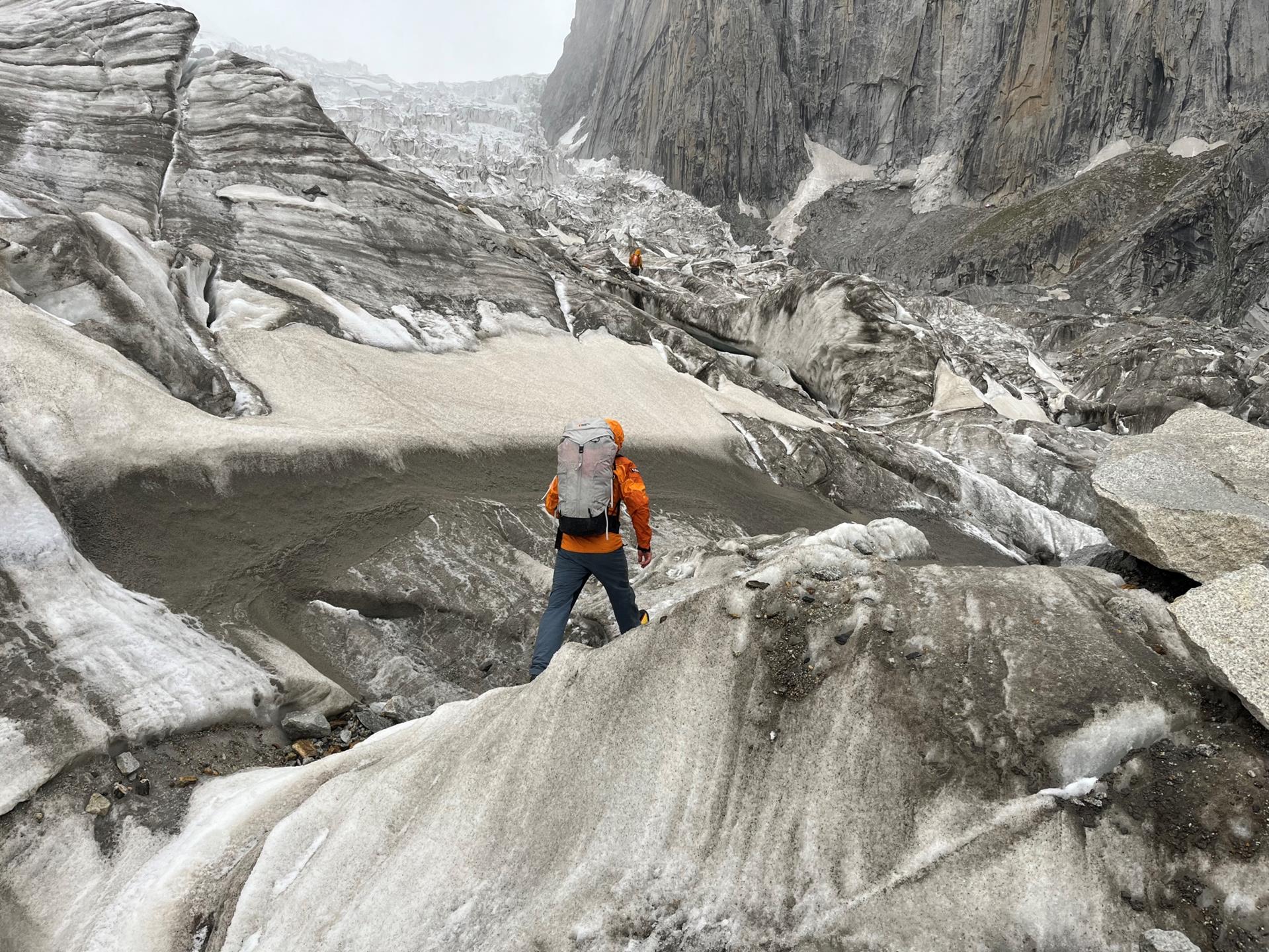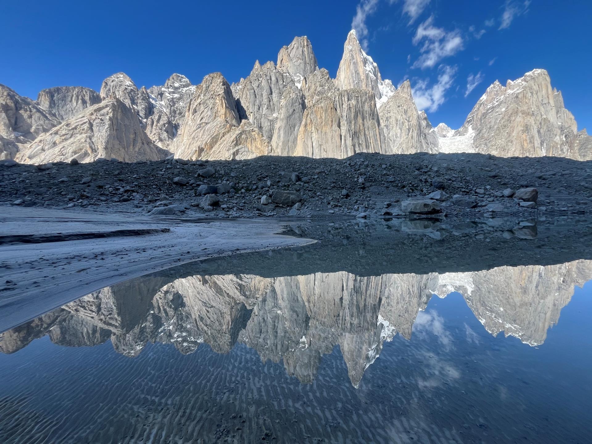 We shared the BC below Great Trango with a group of strong climbers from Czechia and Slovakia. From BC, we trekked four hours over the broken Trango Glacier to reach our ABC near Shipton, located on a beautiful alpine meadow. From there, it was another five hours over an even rougher glacier to the base of the wall. We set up C1 at the foot of the wall under a rock overhang, just 5 minutes to the wall. This whole journey took us 14 long days from Prague. We have 10 days to climb, descend and return to the airport in about 6 days. Time was unforgiving.