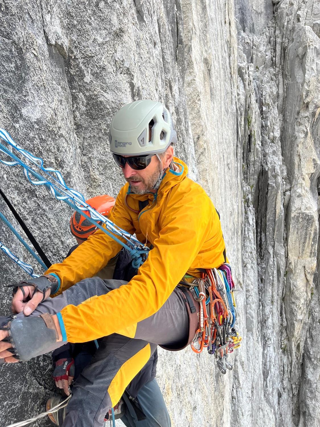 July 11: Lumír tackled the next pitch, a 7a+ corner that required solid technique. Midway, he dislodged a large rock into the valley but reached the anchor of this precariously protected pitch. Šatavis took on the following 7b crack. Halfway through, a snowstorm rolled in, forcing him to retreat to the anchor while we waited an hour for the snow to pass. Eventually, Šatavis fought through the 7b pitch, Lumír cleaned it, and we rappelled again.