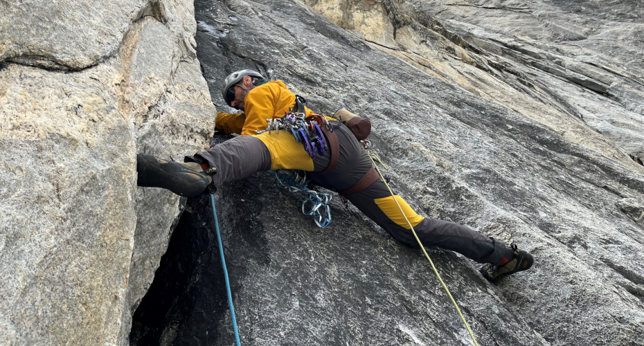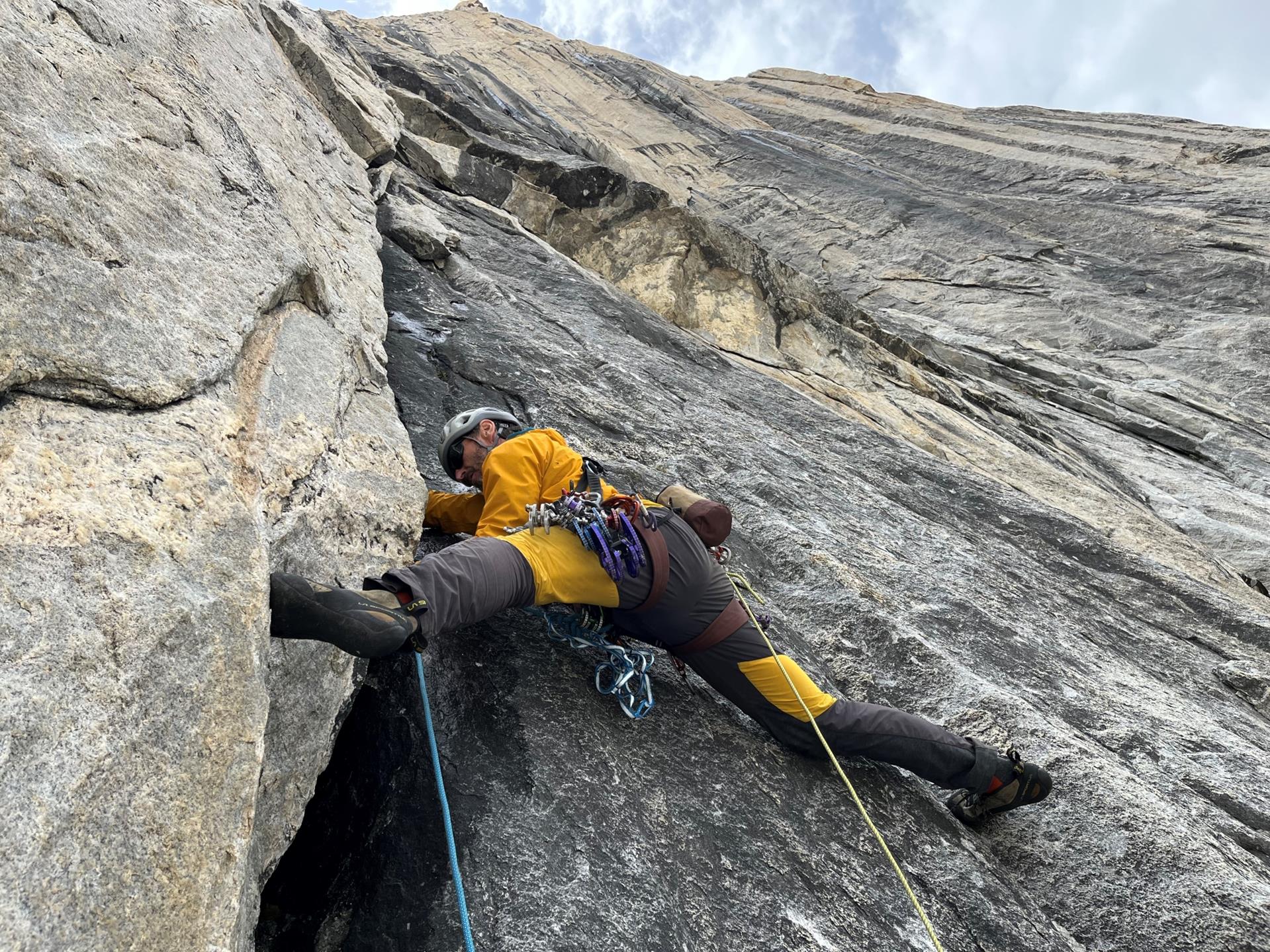July 13: We woke early, hoping to make more progress. Conditions on the wall were terrible, and the weather remained unpredictable. We jumared up our fixed lines. My lead was a 6c+ pitch, 50 meters long. I climbed through a roofed cave to a wide crack. Armed with two #6 Camalots, I placed one at the start and planned to leapfrog the other. The next 15 meters felt like something out of Hláska in the Teplice rocks. Brutal. I gasped for air, struggling with every move. Then it started snowing again, with snowflakes the size of coasters. I had to rest on a cam before finishing the pitch. Šatavis cleaned it, and we rappelled down. The dream of Shipton began to fade.
