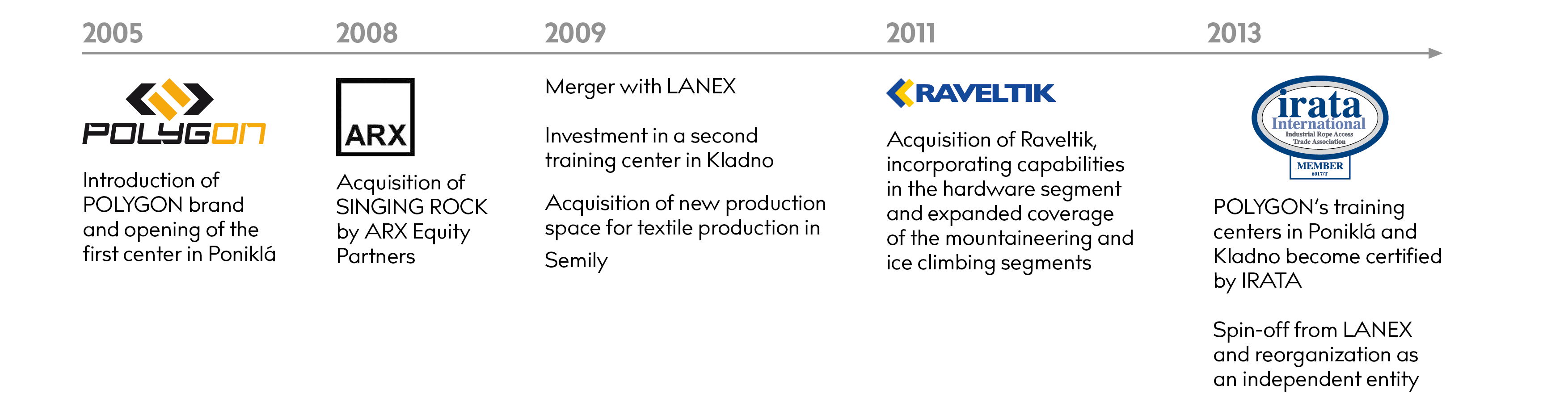 - 2009 – selling Singing Rock s.r.o. to the private financial fund ARX Equity Partners. At the same time Singing Rock s.r.o. and Lanex a.s. merged. The successor company had a business name Lanex a.s.