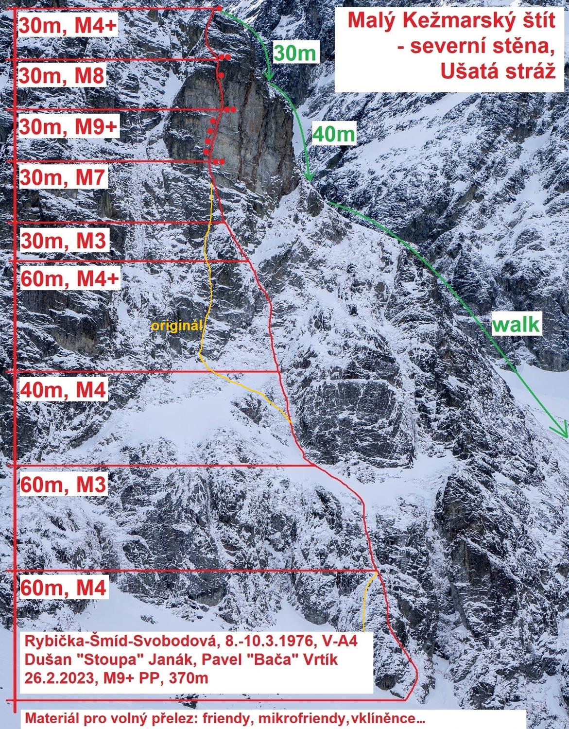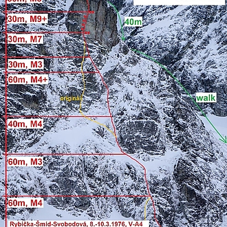 After almost 50 years, the line on the north face of Ušatka is relatively uninteresting from the point of view of technical climbing. The former A4 has become A2 due to many repetitions, the development of climbing gear and a shift in the grading system. However, the overhanging line is a challenge for today's free or mixed winter climbers. Where pitons, bolts, nuts are not used for climbing upwards, but only to catch a fall in the opposite direction.
