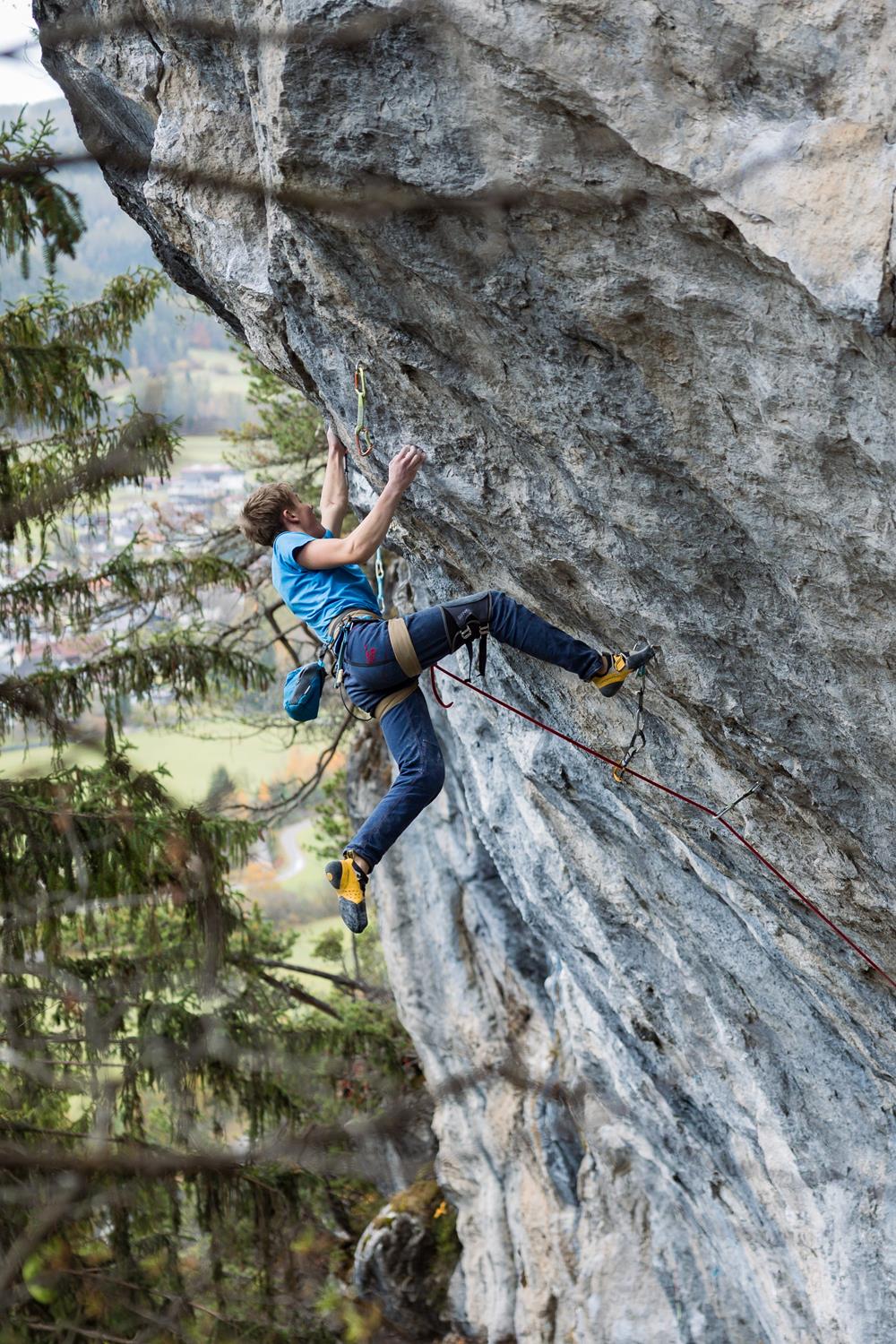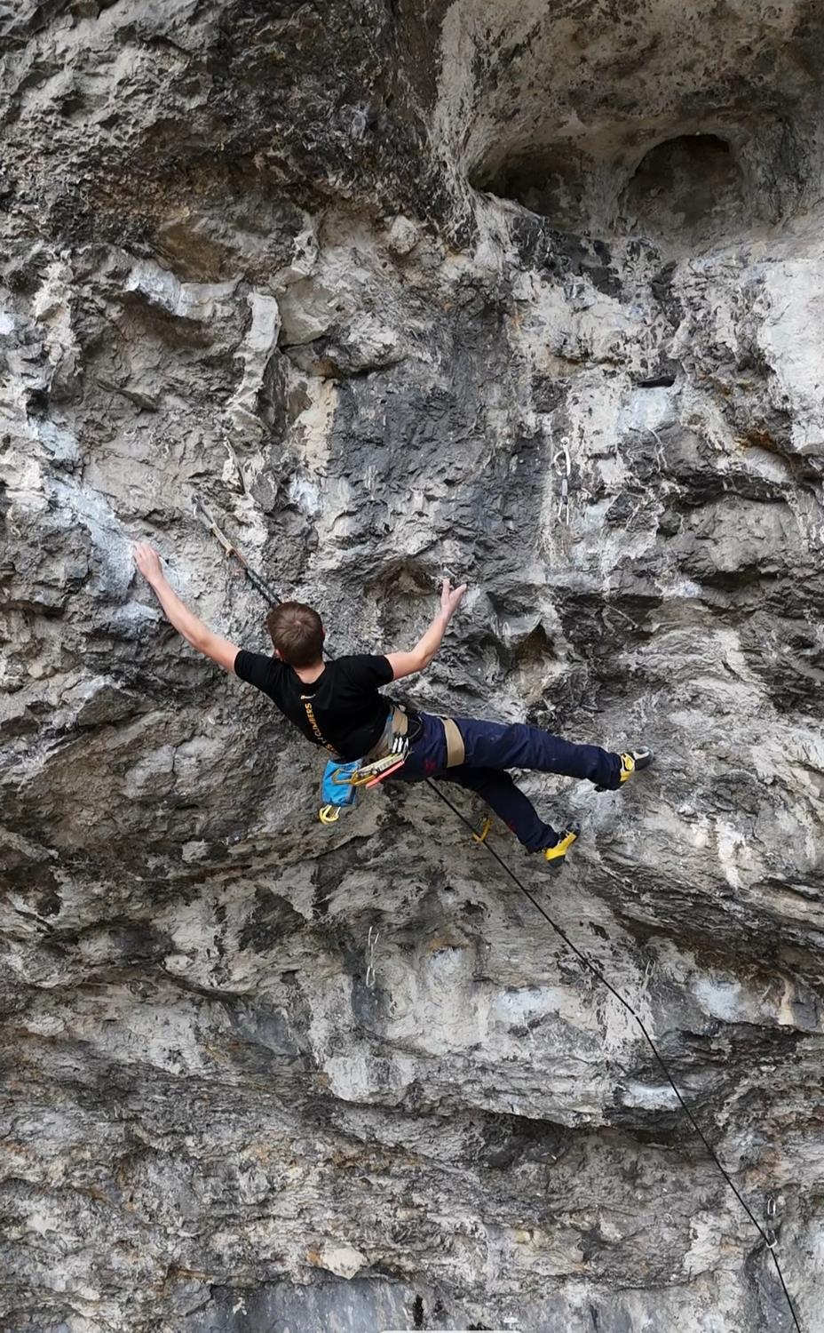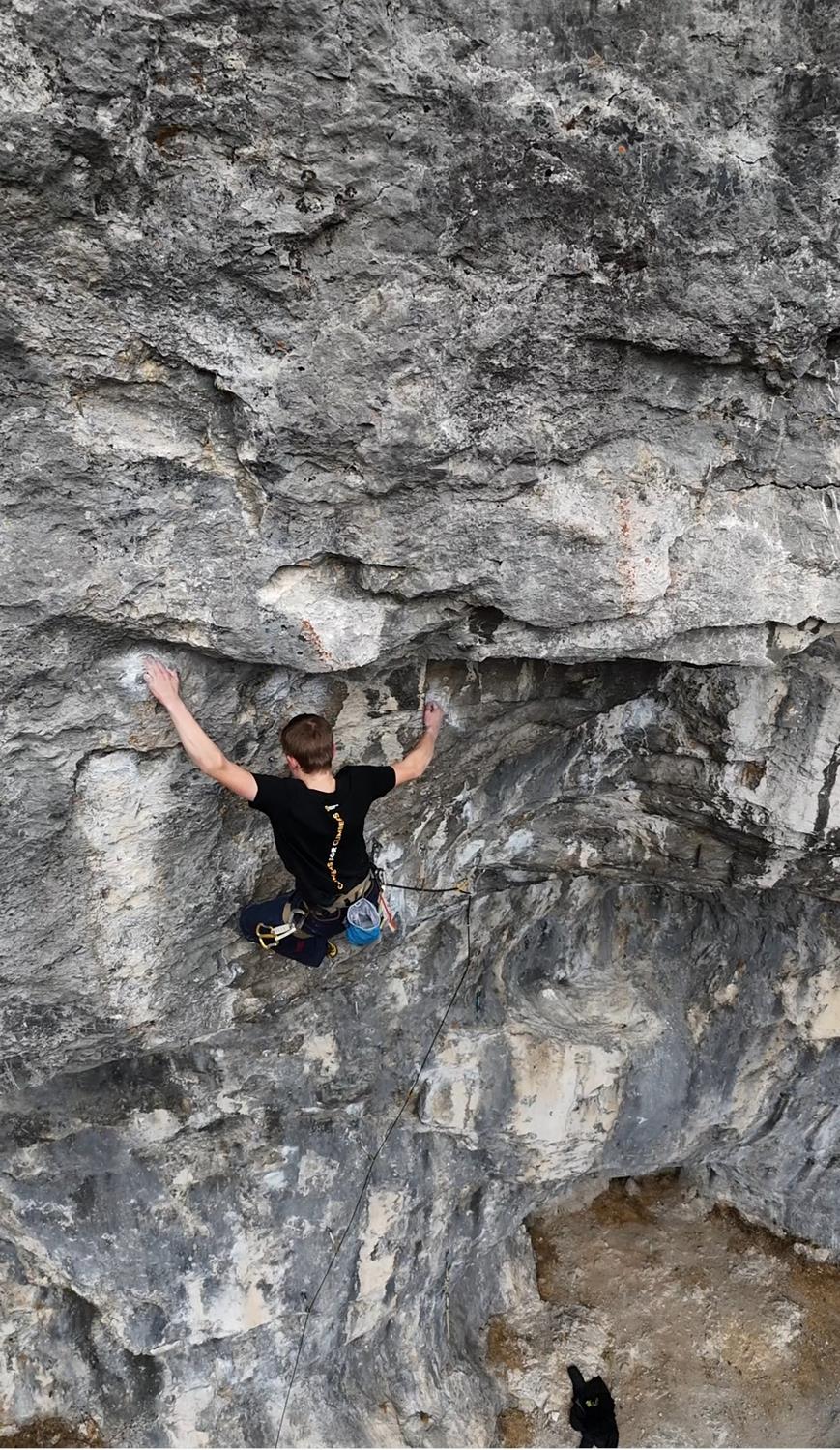 Climbing the route Morpheus 8c in Nassereith, Austria. It really pushed me, because I spent two trips working on it. The hardest crux is a dynamic move from a small undercling where you have to hit the edge precisely and keep your feet under control.