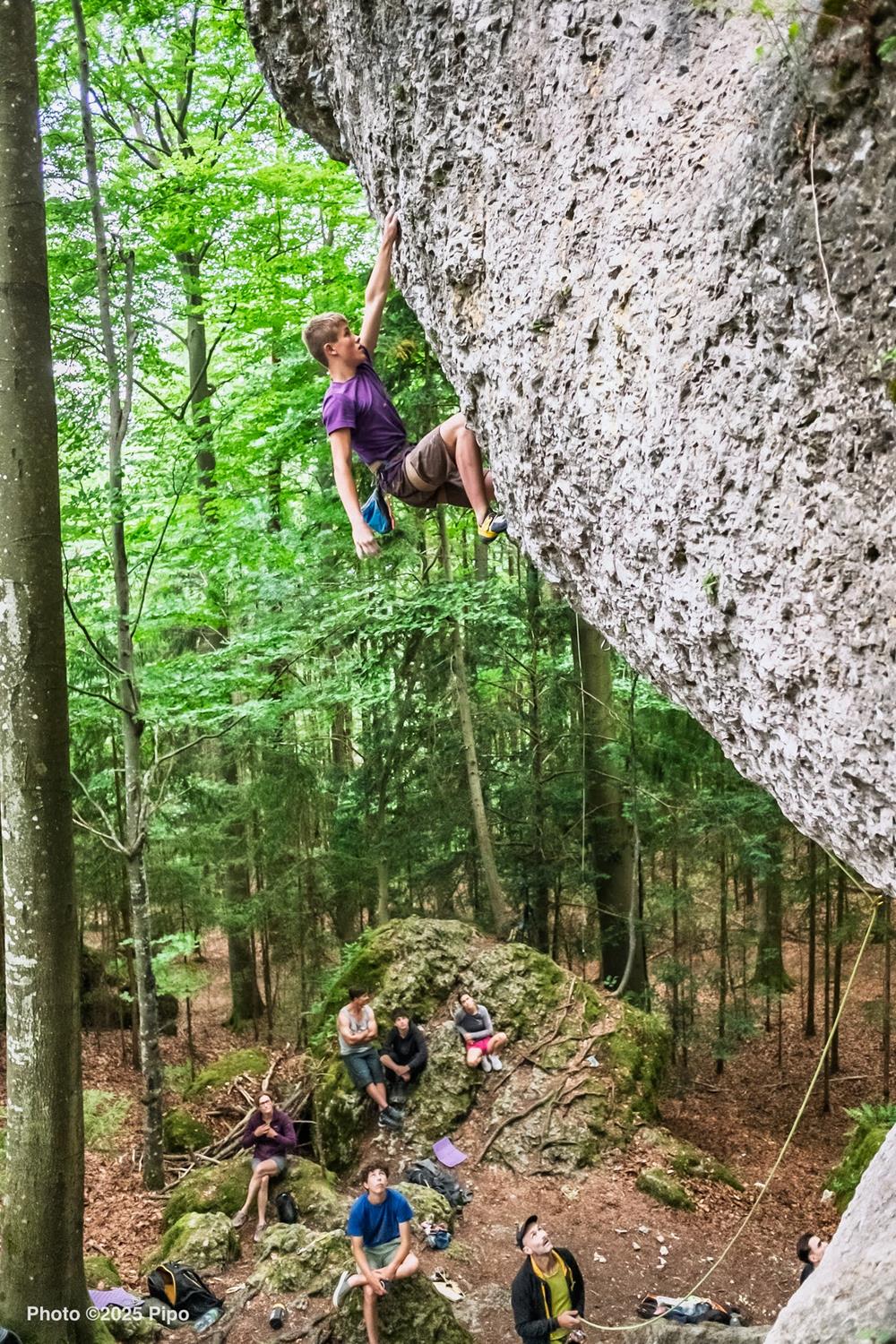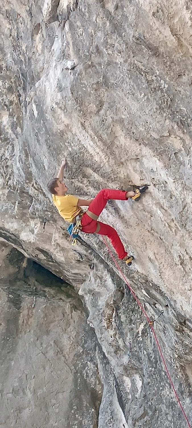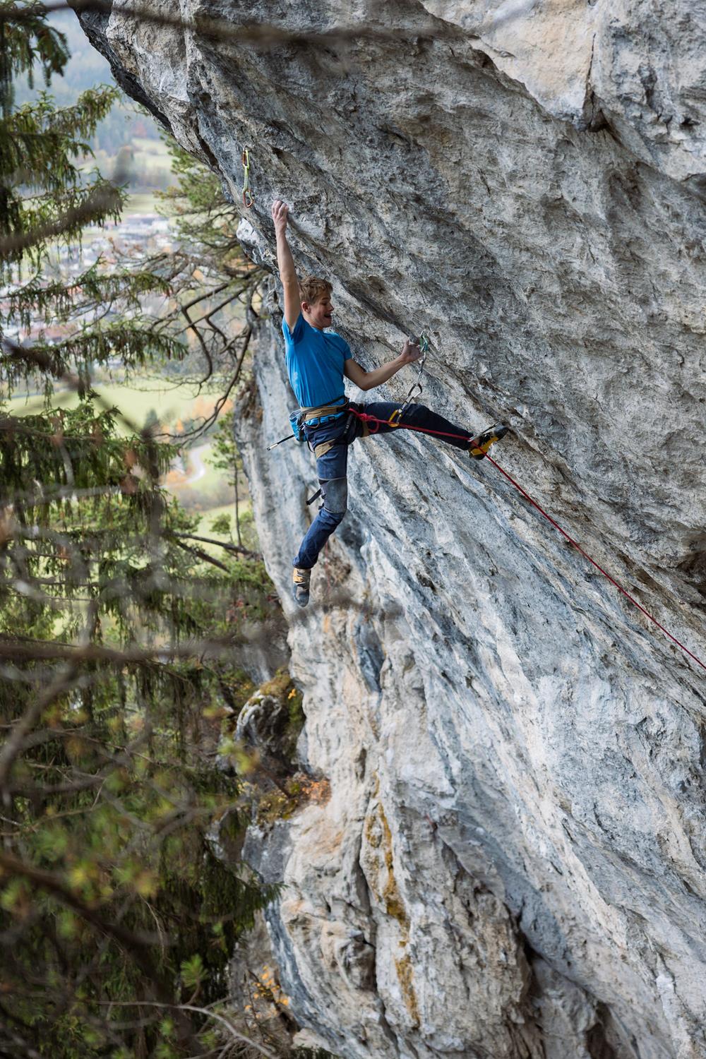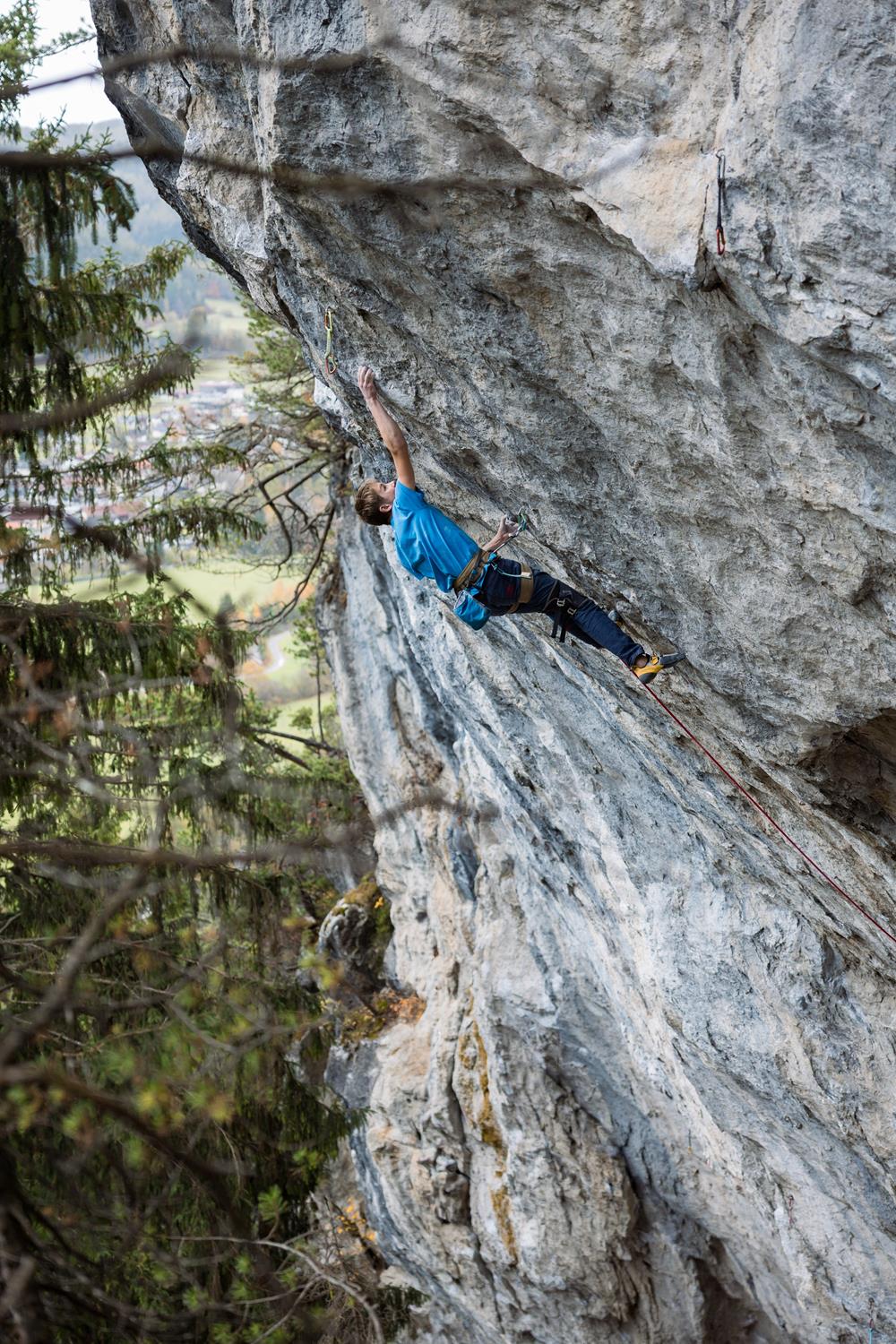 Climbing the route Morpheus 8c in Nassereith, Austria. It really pushed me, because I spent two trips working on it. The hardest crux is a dynamic move from a small undercling where you have to hit the edge precisely and keep your feet under control.